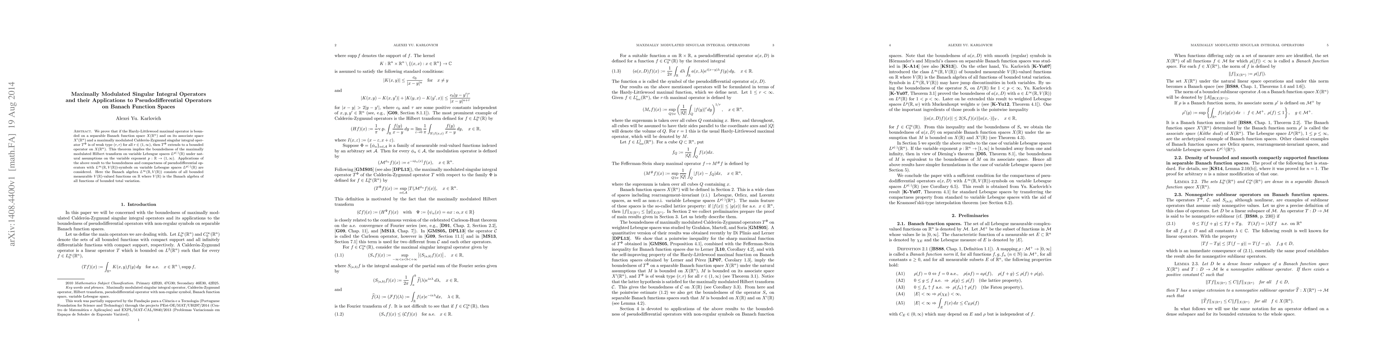 We prove that if the Hardy-Littlewood maximal operator is bounded on a separable Banach function space $X(\mathbb{R}^n)$ and on its associate space $X'(\mathbb{R}^n)$ and a maximally modulated Calder\'on-Zygmund singular integral operator $T^\Phi$ is of weak type $(r,r)$ for all $r\in(1,\infty)$, then $T^\Phi$ extends to a bounded operator on $X(\mathbb{R}^n)$. This theorem implies the boundedness of the maximally modulated Hilbert transform on variable Lebesgue spaces $L^{p(\cdot)}(\mathbb{R})$ under natural assumptions on the variable exponent $p:\mathbb{R}\to(1,\infty)$. Applications of the above result to the boundedness and compactness of pseudodifferential operators with $L^\infty(\mathbb{R},V(\mathbb{R}))$-symbols on variable Lebesgue spaces $L^{p(\cdot)}(\mathbb{R})$ are considered. Here the Banach algebra $L^\infty(\mathbb{R},V(\mathbb{R}))$ consists of all bounded measurable $V(\mathbb{R})$-valued functions on $\mathbb{R}$ where $V(\mathbb{R})$ is the Banach algebra of all functions of bounded total variation.
