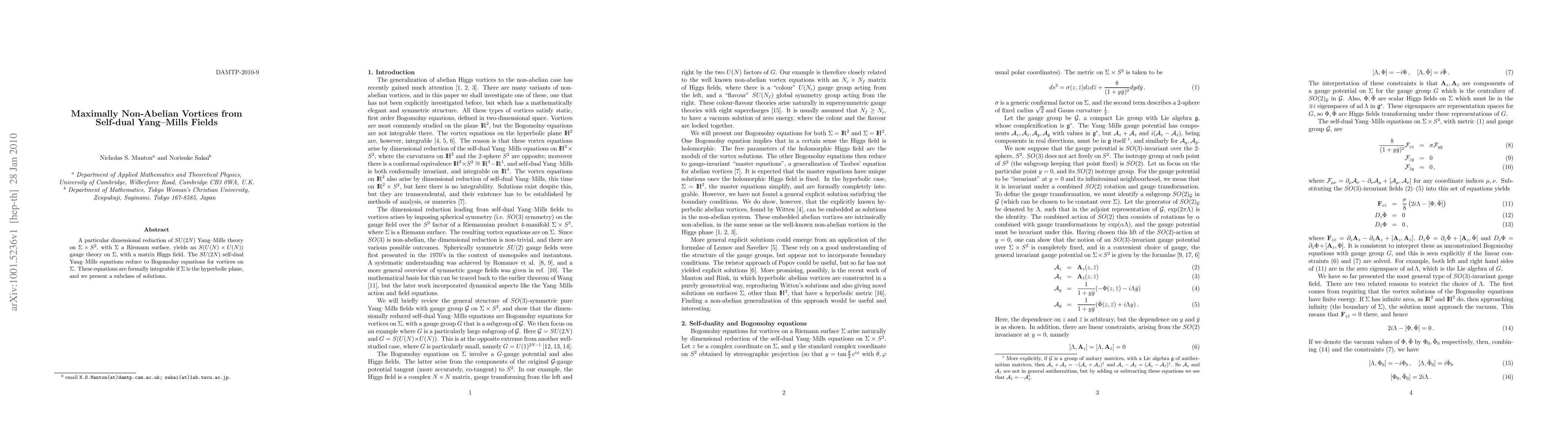 A particular dimensional reduction of SU(2N) Yang--Mills theory on $\Sigma \times S^2$, with $\Sigma$ a Riemann surface, yields an $S(U(N) \times U(N))$ gauge theory on $\Sigma$, with a matrix Higgs field. The SU(2N) self-dual Yang--Mills equations reduce to Bogomolny equations for vortices on $\Sigma$. These equations are formally integrable if $\Sigma$ is the hyperbolic plane, and we present a subclass of solutions.