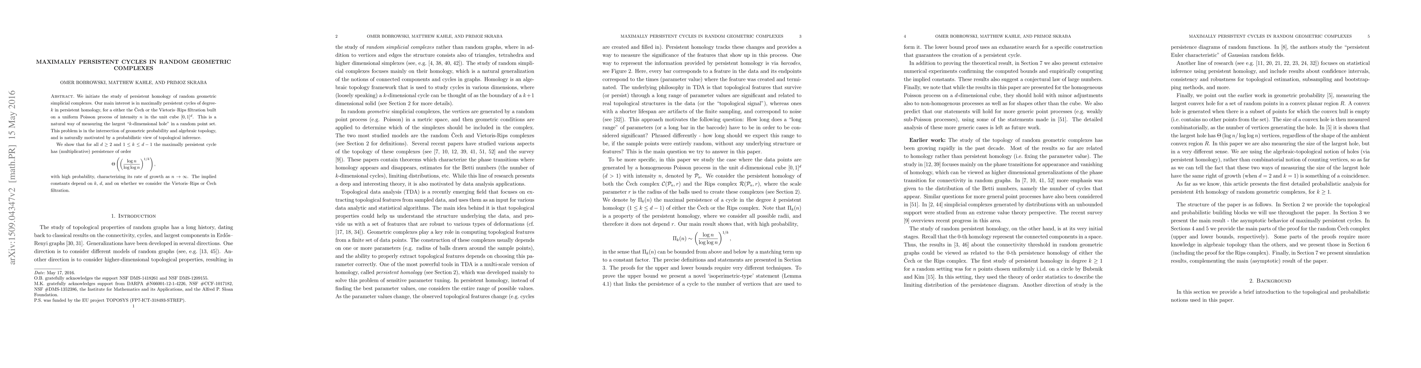We initiate the study of persistent homology of random geometric simplicial complexes. Our main interest is in maximally persistent cycles of degree-$k$ in persistent homology, for a either the \cech or the Vietoris--Rips filtration built on a uniform Poisson process of intensity $n$ in the unit cube $[0,1]^d$. This is a natural way of measuring the largest "$k$-dimensional hole" in a random point set. This problem is in the intersection of geometric probability and algebraic topology, and is naturally motivated by a probabilistic view of topological inference. We show that for all $d \ge 2$ and $1 \le k \le d-1$ the maximally persistent cycle has (multiplicative) persistence of order $$ \Theta \left(\left(\frac{\log n}{\log \log n} \right)^{1/k} \right),$$ with high probability, characterizing its rate of growth as $n \to \infty$. The implied constants depend on $k$, $d$, and on whether we consider the Vietoris--Rips or \cech filtration.
