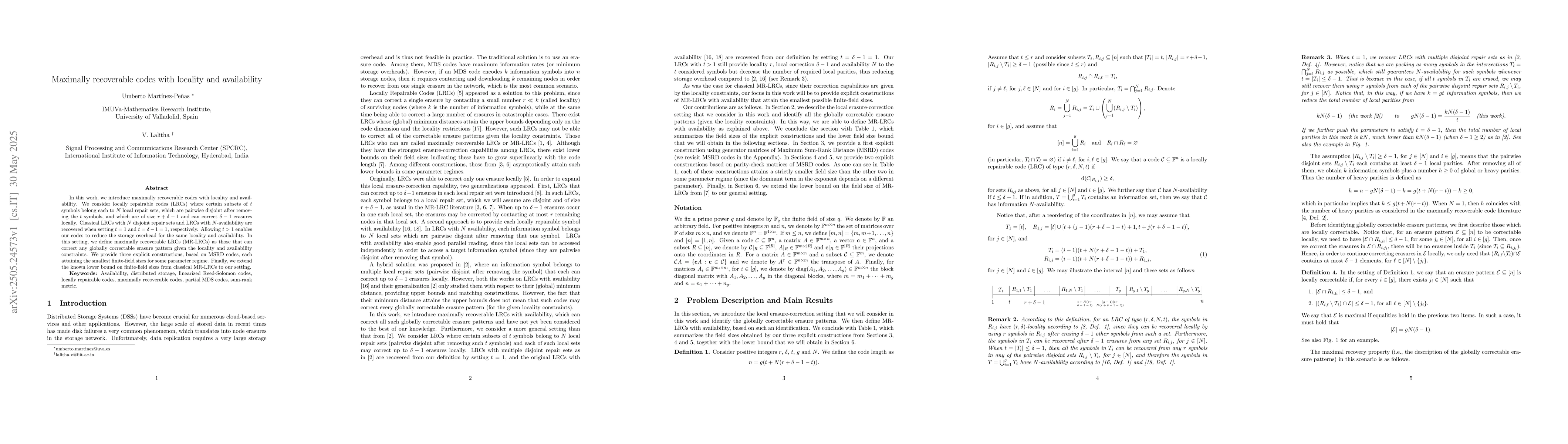 The paper introduces maximally recoverable codes with locality and availability, building upon locally repairable codes (LRCs) and extending classical MR-LRC concepts.