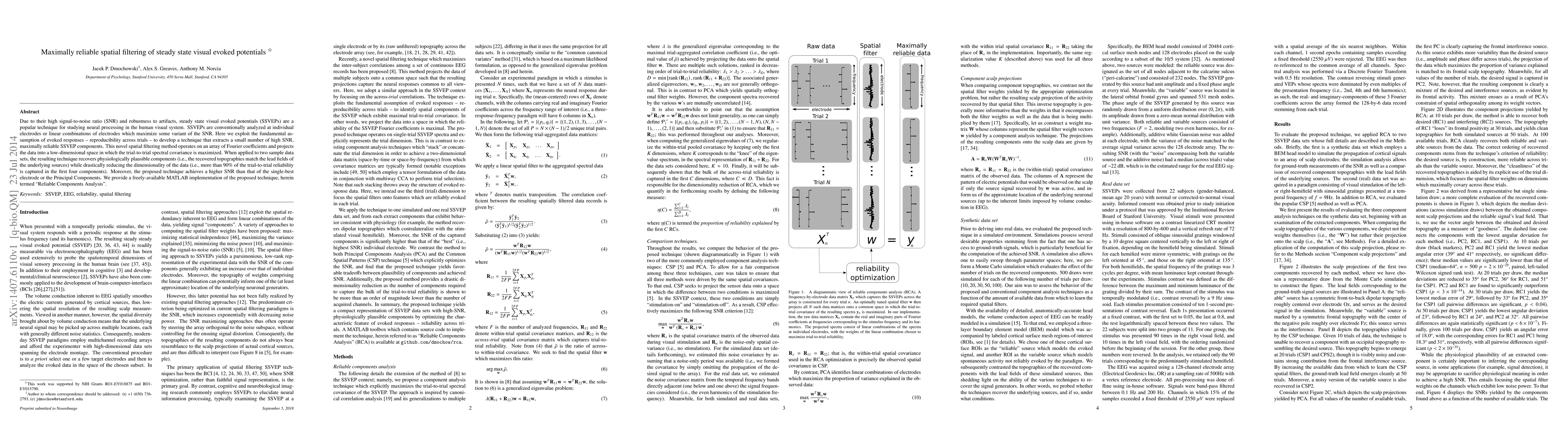 This paper introduces a novel spatial filtering technique for extracting high SNR, maximally reliable components from steady state visual evoked potentials (SSVEPs), achieving higher SNR than conventional methods and significantly reducing data dimensionality while maintaining physiological plausibility. The technique, termed "Reliable Components Analysis," maximizes trial-to-trial spectral covariance and is made available via a MATLAB implementation.
