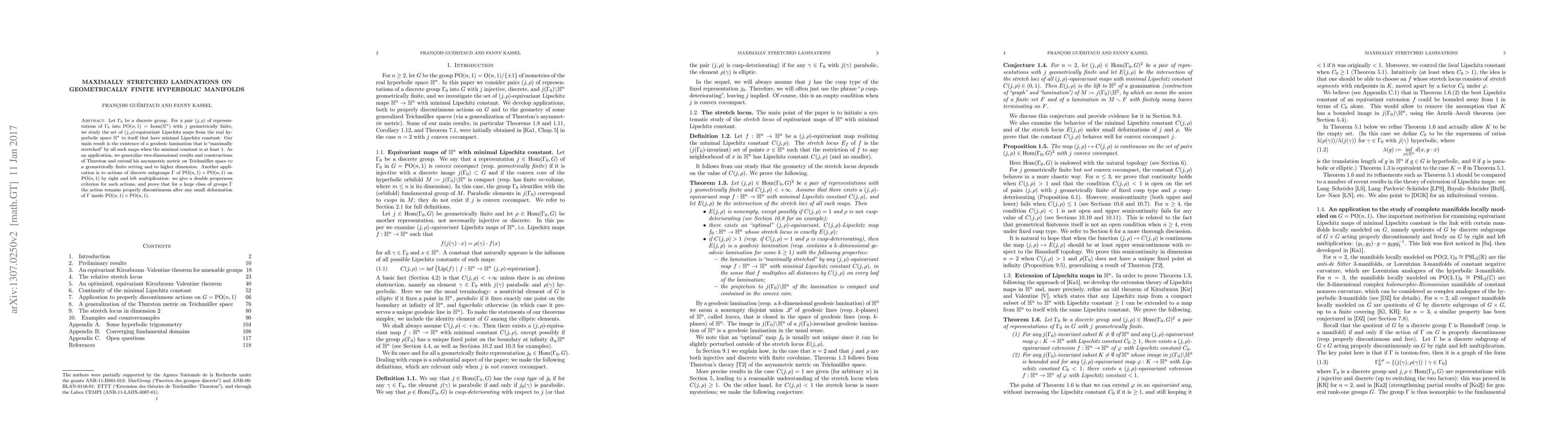 Let Gamma_0 be a discrete group. For a pair (j,rho) of representations of Gamma_0 into PO(n,1)=Isom(H^n) with j geometrically finite, we study the set of (j,rho)-equivariant Lipschitz maps from the real hyperbolic space H^n to itself that have minimal Lipschitz constant. Our main result is the existence of a geodesic lamination that is "maximally stretched" by all such maps when the minimal constant is at least 1. As an application, we generalize two-dimensional results and constructions of Thurston and extend his asymmetric metric on Teichm\"uller space to a geometrically finite setting and to higher dimension. Another application is to actions of discrete subgroups Gamma of PO(n,1)xPO(n,1) on PO(n,1) by right and left multiplication: we give a double properness criterion for such actions, and prove that for a large class of groups Gamma the action remains properly discontinuous after any small deformation of Gamma inside PO(n,1)xPO(n,1).
