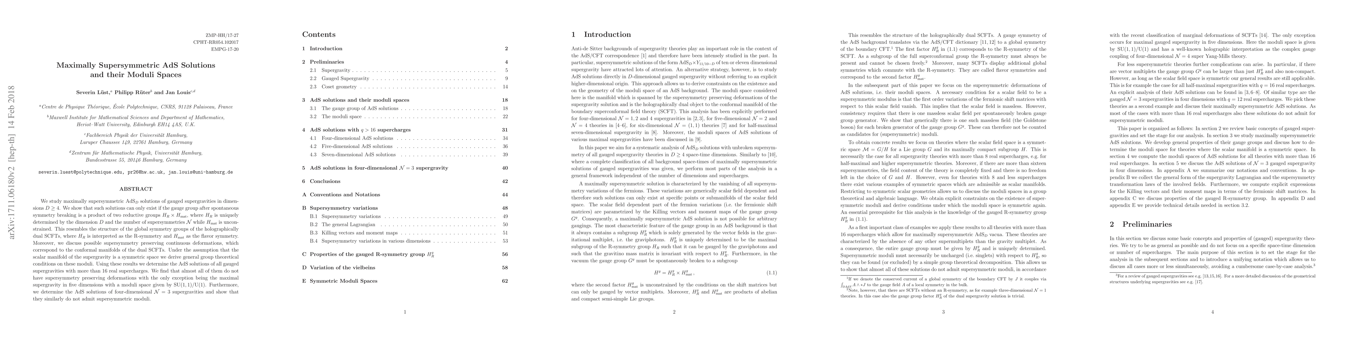 We study maximally supersymmetric AdS$_D$ solutions of gauged supergravities in dimensions $D \geq 4$. We show that such solutions can only exist if the gauge group after spontaneous symmetry breaking is a product of two reductive groups $H_R \times H_\mathrm{mat}$, where $H_R$ is uniquely determined by the dimension D and the number of supersymmetries N while $H_\mathrm{mat}$ is unconstrained. This resembles the structure of the global symmetry groups of the holographically dual SCFTs, where $H_R$ is interpreted as the R-symmetry and $H_\mathrm{mat}$ as the flavor symmetry. Moreover, we discuss possible supersymmetry preserving continuous deformations, which correspond to the conformal manifolds of the dual SCFTs. Under the assumption that the scalar manifold of the supergravity is a symmetric space we derive general group theoretical conditions on these moduli. Using these results we determine the AdS solutions of all gauged supergravities with more than 16 real supercharges. We find that almost all of them do not have supersymmetry preserving deformations with the only exception being the maximal supergravity in five dimensions with a moduli space given by $SU(1,1)/U(1)$. Furthermore, we determine the AdS solutions of four-dimensional N=3 supergravities and show that they similarly do not admit supersymmetric moduli.