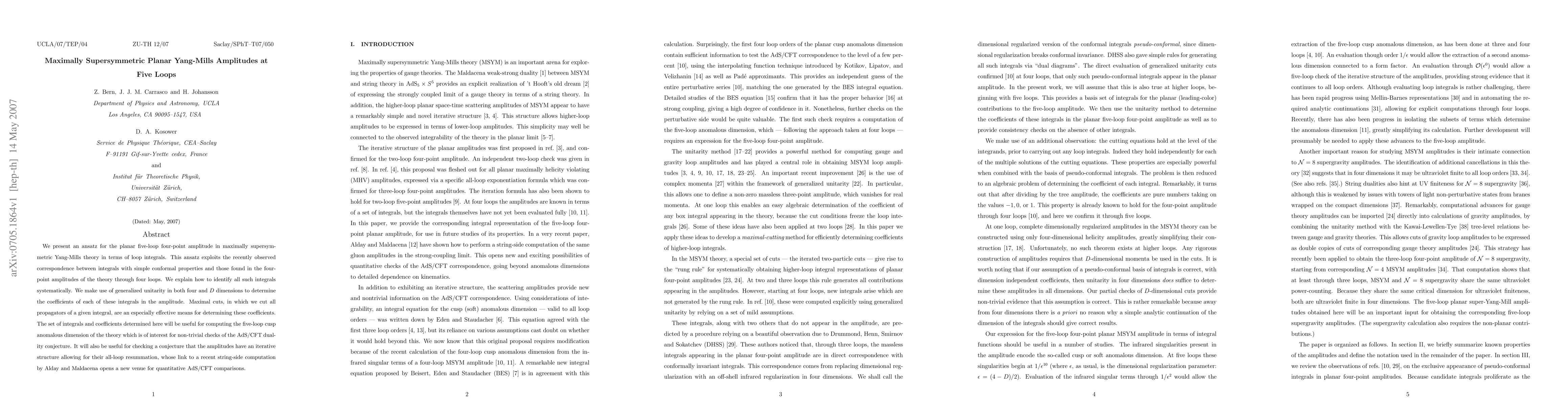 This paper proposes an ansatz for computing the five-loop four-point amplitude in maximally supersymmetric Yang-Mills theory, leveraging conformal properties and generalized unitarity. The approach determines coefficients through maximal cuts, aiding in the computation of the five-loop cusp anomalous dimension and testing the AdS/CFT duality conjecture.