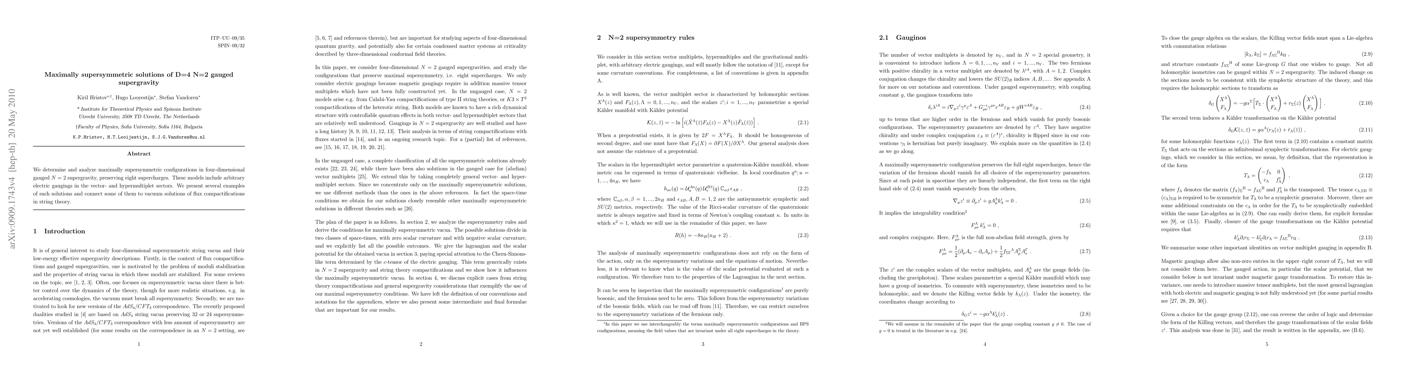 This paper identifies and explores maximally supersymmetric solutions in four-dimensional gauged N=2 supergravity, preserving eight supercharges, and includes arbitrary electric gaugings. Examples are provided and connections are drawn to vacuum solutions in string theory flux compactifications.