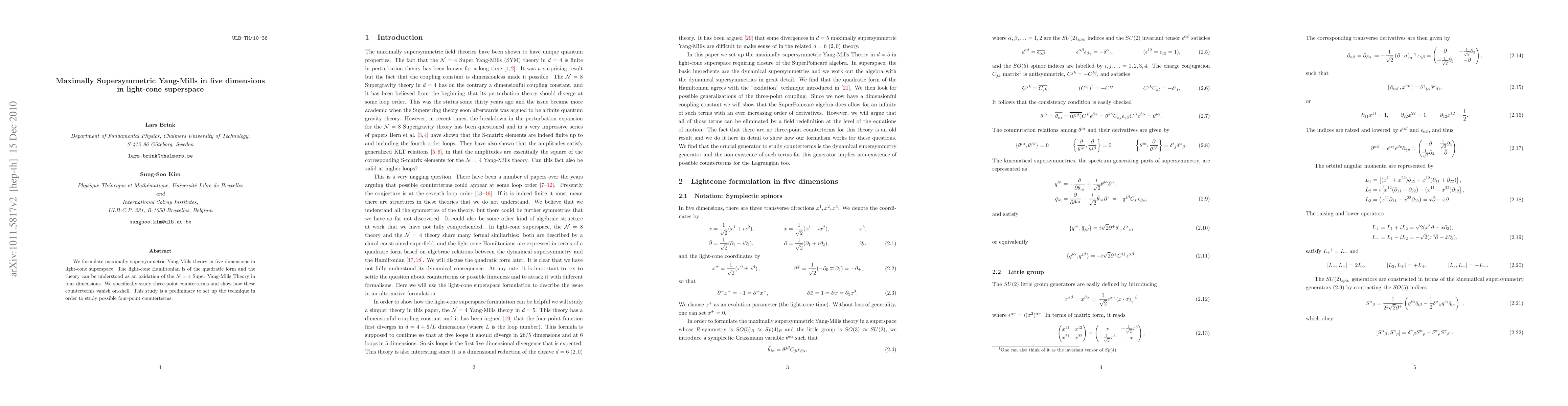We formulate maximally supersymmetric Yang-Mills theory in five dimensions in light-cone superspace. The light-cone Hamiltonian is of the quadratic form and the theory can be understood as an oxidation of the N=4 Super Yang-Mills Theory in four dimensions. We specifically study three-point counterterms and show how these counterterms vanish on-shell. This study is a preliminary to set up the technique in order to study possible four-point counterterms.