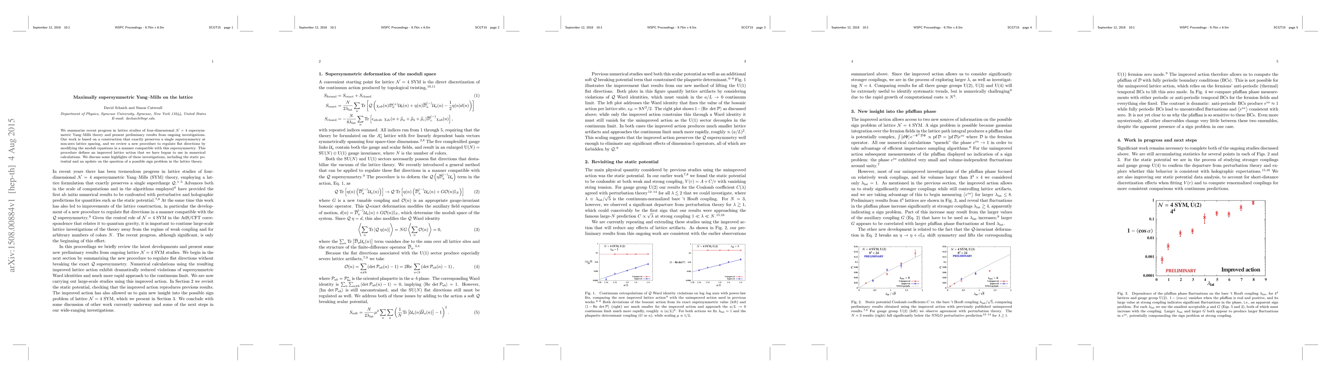 We summarize recent progress in lattice studies of four-dimensional N=4 supersymmetric Yang--Mills theory and present preliminary results from ongoing investigations. Our work is based on a construction that exactly preserves a single supersymmetry at non-zero lattice spacing, and we review a new procedure to regulate flat directions by modifying the moduli equations in a manner compatible with this supersymmetry. This procedure defines an improved lattice action that we have begun to use in numerical calculations. We discuss some highlights of these investigations, including the static potential and an update on the question of a possible sign problem in the lattice theory.