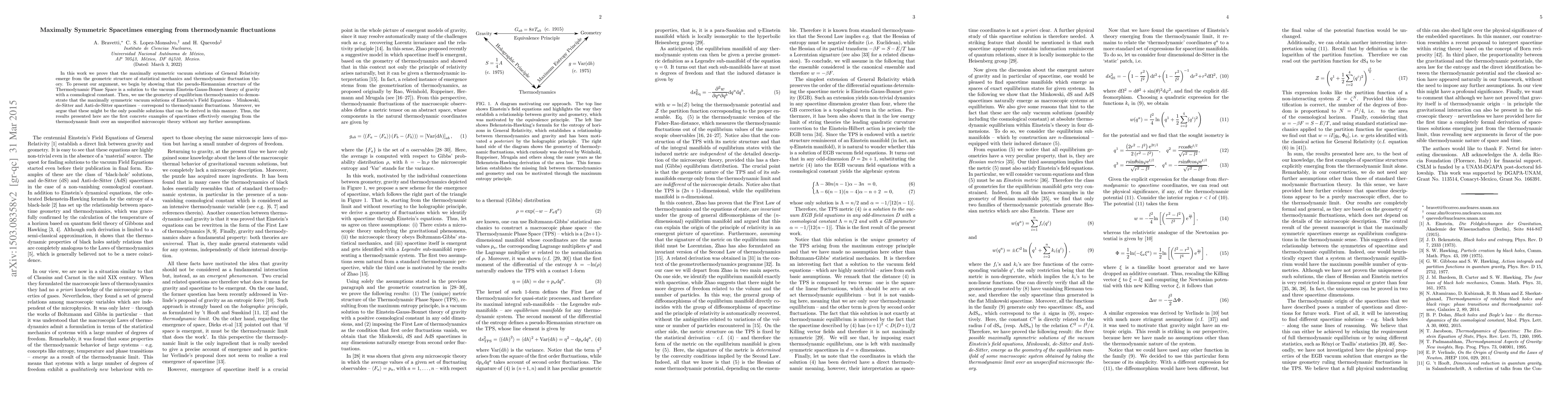 In this work we prove that the maximally symmetric vacuum solutions of General Relativity emerge from the geometric structure of statistical mechanics and thermodynamic fluctuation theory. To present our argument, we begin by showing that the pseudo-Riemannian structure of the Thermodynamic Phase Space is a solution to the vacuum Einstein-Gauss-Bonnet theory of gravity with a cosmological constant. Then, we use the geometry of equilibrium thermodynamics to demonstrate that the maximally symmetric vacuum solutions of Einstein's Field Equations -- Minkowski, de-Sitter and Anti-de-Sitter spacetimes -- correspond to thermodynamic fluctuations. Moreover, we argue that these might be the only possible solutions that can be derived in this manner. Thus, the results presented here are the first concrete examples of spacetimes effectively emerging from the thermodynamic limit over an unspecified microscopic theory without any further assumptions.