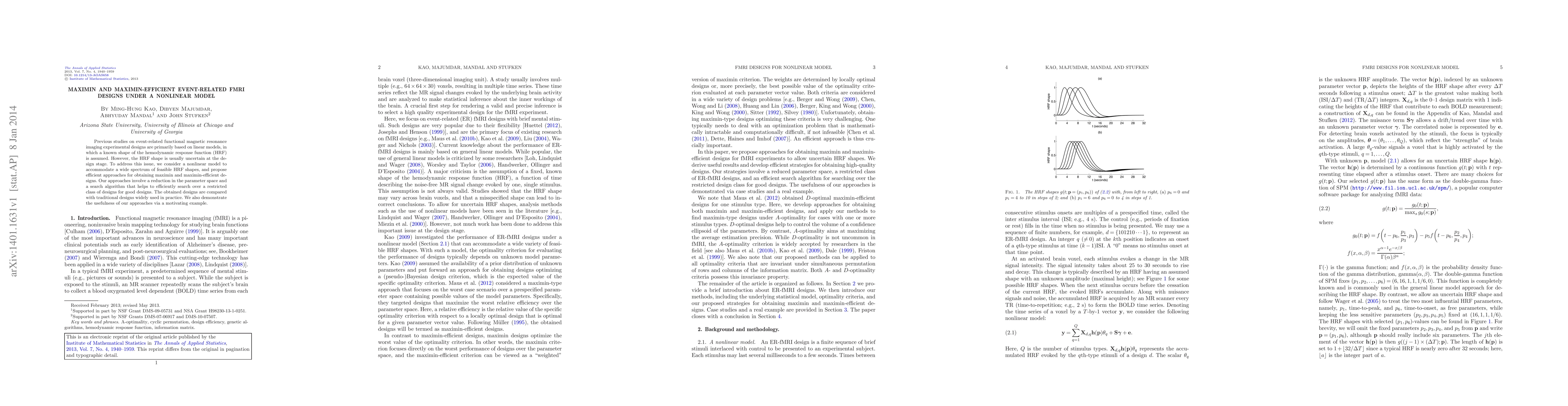 This paper proposes new event-related fMRI design methods based on a nonlinear model to accommodate uncertain hemodynamic response function shapes, and introduces efficient maximin and maximin-efficient designs through reduced parameter space and search algorithms. The proposed designs are compared with traditional linear model designs and validated through a practical example.