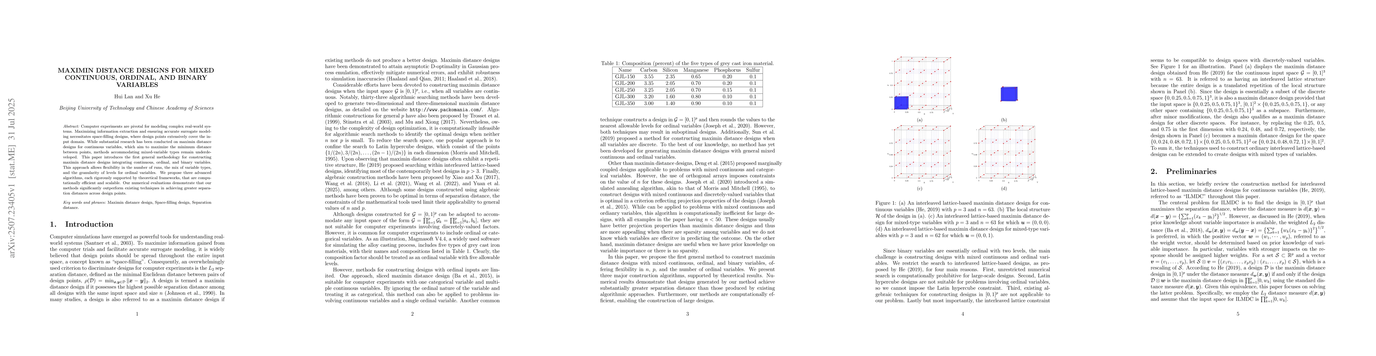 This paper presents a novel methodology for creating maximin distance designs that accommodate continuous, ordinal, and binary variables, offering flexibility in design point allocation and outperforming existing techniques in terms of separation distances.