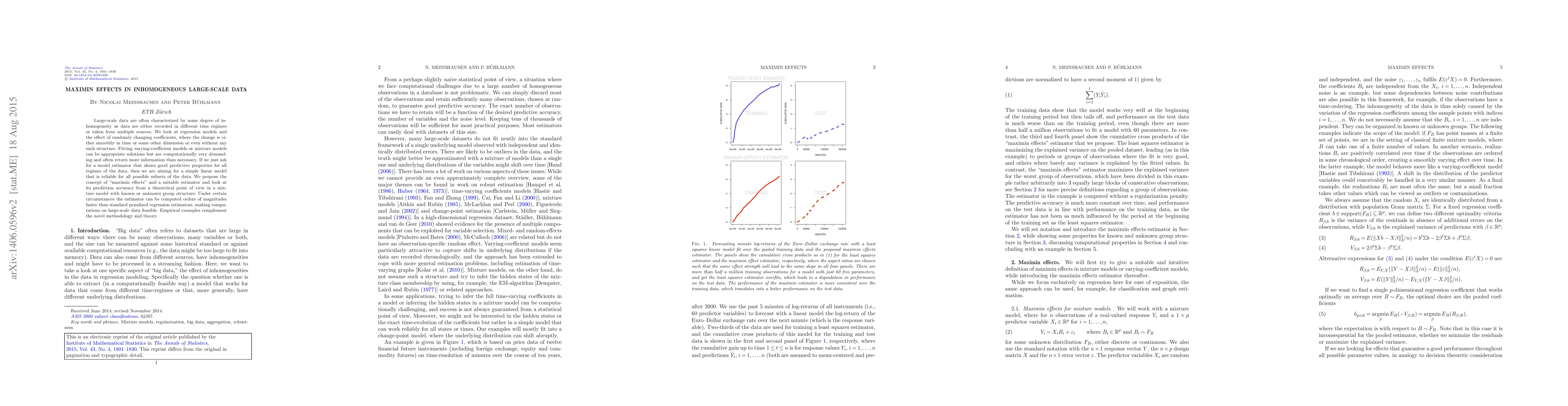 Large-scale data are often characterized by some degree of inhomogeneity as data are either recorded in different time regimes or taken from multiple sources. We look at regression models and the effect of randomly changing coefficients, where the change is either smoothly in time or some other dimension or even without any such structure. Fitting varying-coefficient models or mixture models can be appropriate solutions but are computationally very demanding and often return more information than necessary. If we just ask for a model estimator that shows good predictive properties for all regimes of the data, then we are aiming for a simple linear model that is reliable for all possible subsets of the data. We propose the concept of "maximin effects" and a suitable estimator and look at its prediction accuracy from a theoretical point of view in a mixture model with known or unknown group structure. Under certain circumstances the estimator can be computed orders of magnitudes faster than standard penalized regression estimators, making computations on large-scale data feasible. Empirical examples complement the novel methodology and theory.