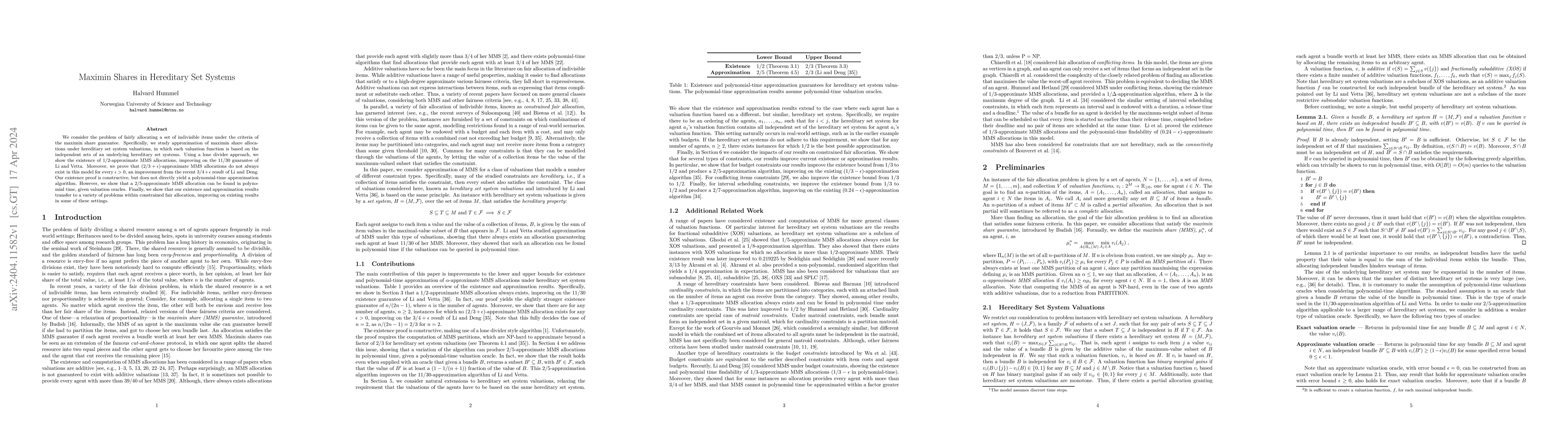 This paper addresses the fair allocation of indivisible items using maximin share guarantees in hereditary set systems. It presents a $1/2$-approximate maximin share allocation via a lone divider approach, improving upon previous results, and proves that no $(2/3 + \epsilon)$-approximation always exists. Additionally, it demonstrates a $2/5$-approximate solution obtainable in polynomial time.