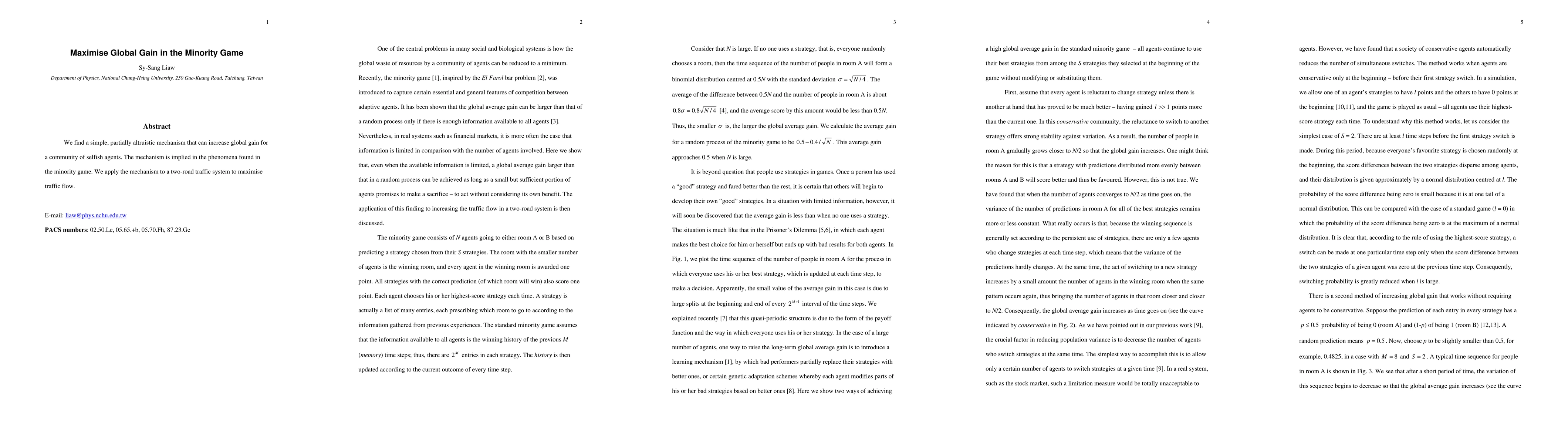 Researchers discovered a simple mechanism to increase global gain in the minority game, a phenomenon observed in traffic flow systems, leading to improved traffic flow by balancing selfish agents' actions.