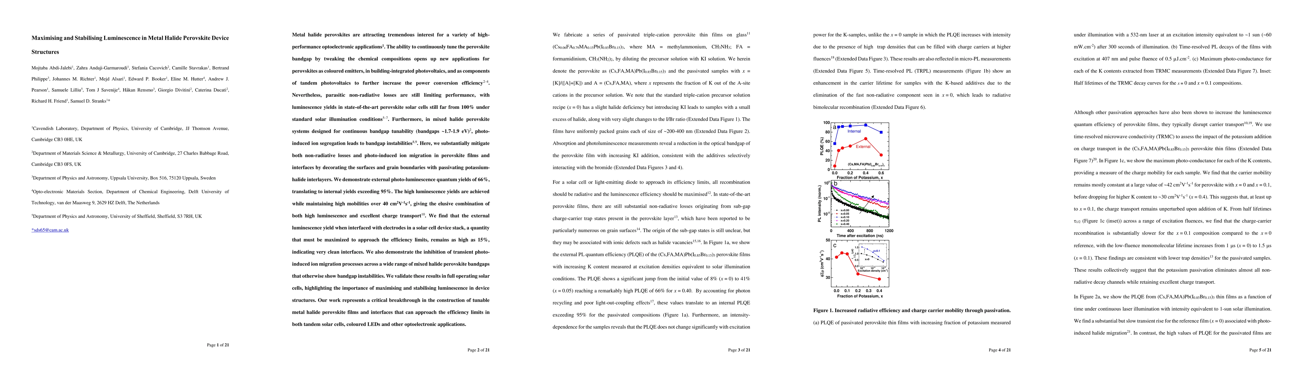 This research paper investigates methods to enhance and stabilize luminescence in metal halide perovskite devices by using potassium-halide interlayers to passivate surfaces and grain boundaries. It reports achieving 66% external photoluminescence quantum yield and 95% internal yield, while maintaining high charge transport, thus approaching the efficiency limits for solar cells and LEDs.