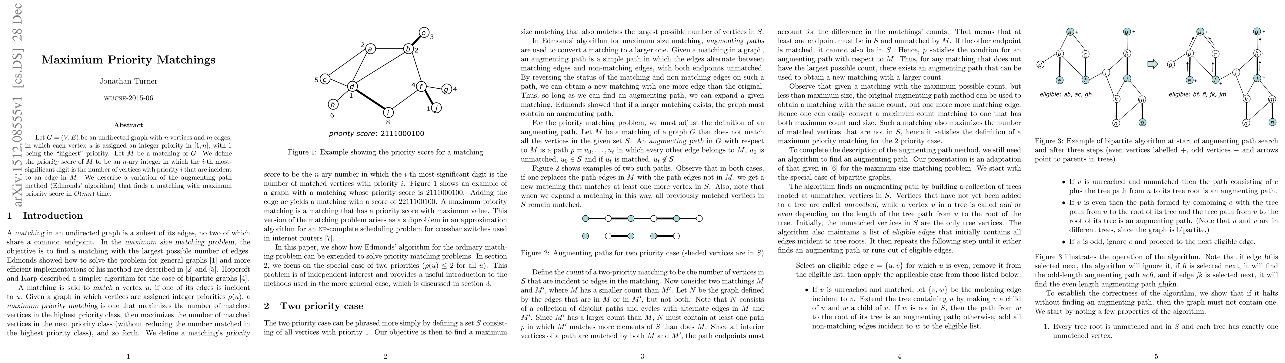 Let $G=(V,E)$ be an undirected graph with $n$ vertices and $m$ edges, in which each vertex $u$ is assigned an integer priority in $[1,n]$, with 1 being the "highest" priority. Let $M$ be a matching of $G$. We define the priority score of $M$ to be an $n$-ary integer in which the $i$-th most-significant digit is the number of vertices with priority $i$ that are incident to an edge in $M$. We describe a variation of the augmenting path method (Edmonds' algorithm) that finds a matching with maximum priority score in $O(mn)$ time.
