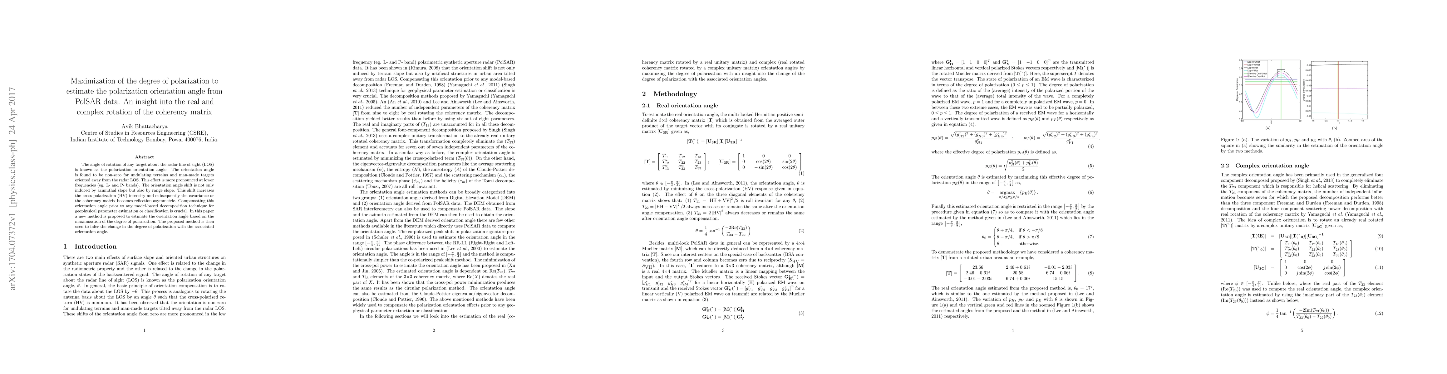 The angle of rotation of any target about the radar line of sight (LOS) is known as the polarization orientation angle. The orientation angle is found to be non-zero for undulating terrains and man-made targets oriented away from the radar LOS. This effect is more pronounced at lower frequencies (eg. L- and P- bands). The orientation angle shift is not only induced by azimuthal slope but also by range slope. This shift increases the cross-polarization (HV) intensity and subsequently, the covariance or the coherency matrix becomes reflection asymmetric. Compensating this orientation angle prior to any model-based decomposition technique for geophysical parameter estimation or classification is crucial. In this paper, a new method is proposed to estimate the orientation angle based on the maximization of the degree of polarization. The proposed method is then used to infer the change in the degree of polarization with the associated orientation angle.