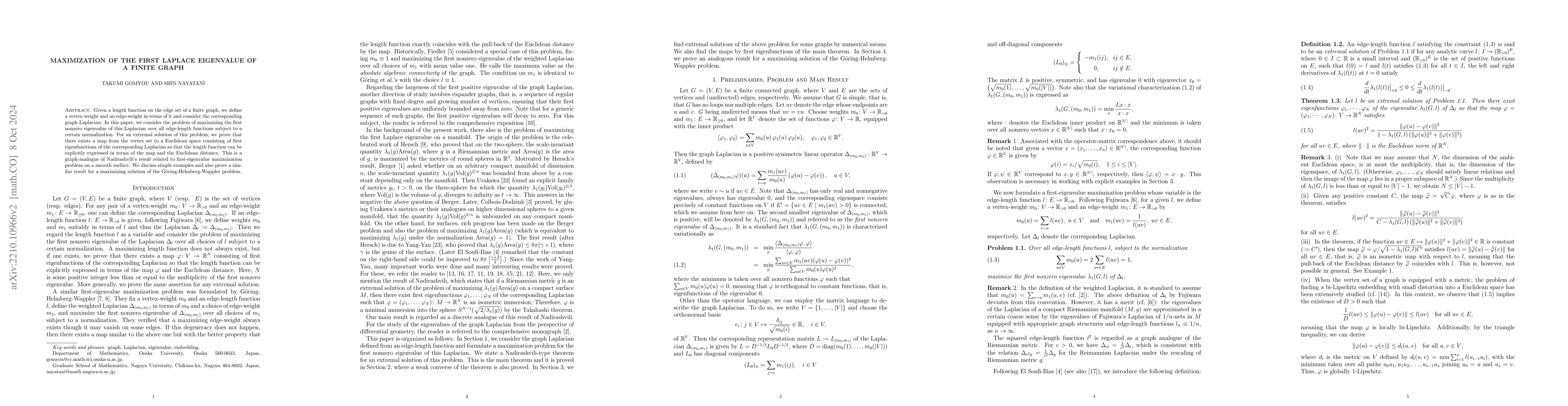 This paper investigates the maximization of a graph's first Laplace eigenvalue under a defined length function, proving that an extremal solution allows for an explicit expression of the length function in terms of a map from the vertex set to Euclidean space. It draws a parallel to Nadirashvili's result on smooth surfaces and extends the findings to the Goering-Helmberg-Wappler problem.