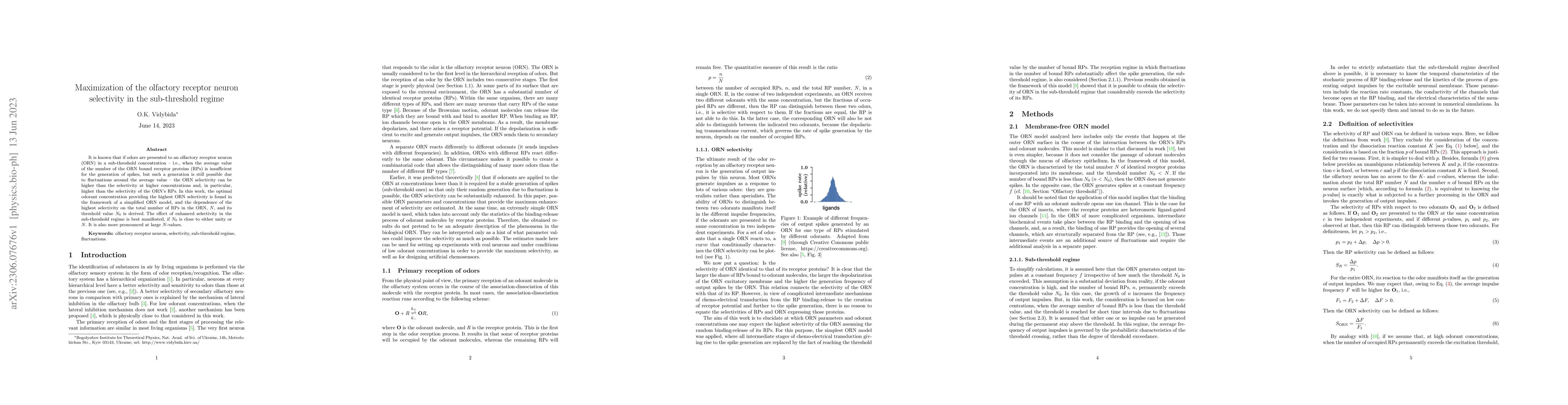 This paper investigates the optimal sub-threshold concentration for maximizing olfactory receptor neuron (ORN) selectivity, finding that the highest selectivity occurs at concentrations where fluctuations can still trigger spike generation despite insufficient average receptor protein binding. The study reveals that the greatest selectivity enhancement is observed when the threshold value is near 1 or the total number of receptor proteins, especially for large receptor protein counts.