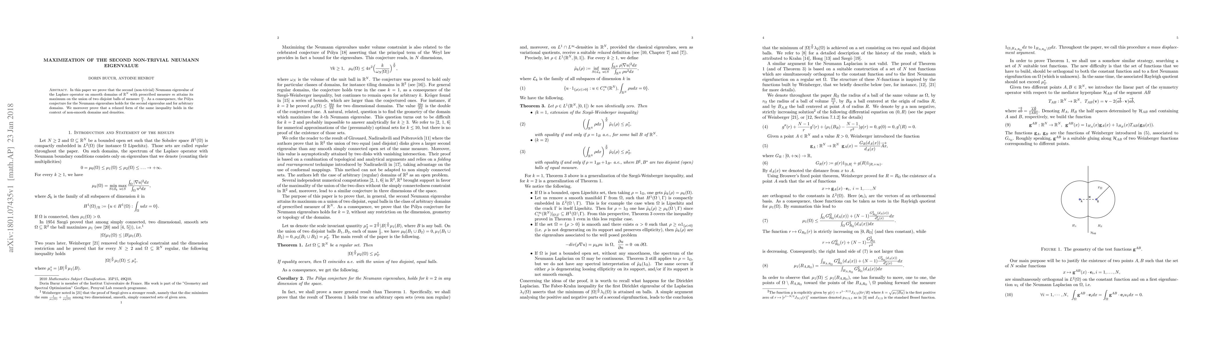 This paper demonstrates that the maximum of the second non-trivial Neumann eigenvalue for the Laplace operator on smooth domains with a given measure is achieved when the domain is the union of two disjoint balls of half the measure. It also verifies the Pólya conjecture for the second eigenvalue in this context and extends the result to non-smooth domains with densities.