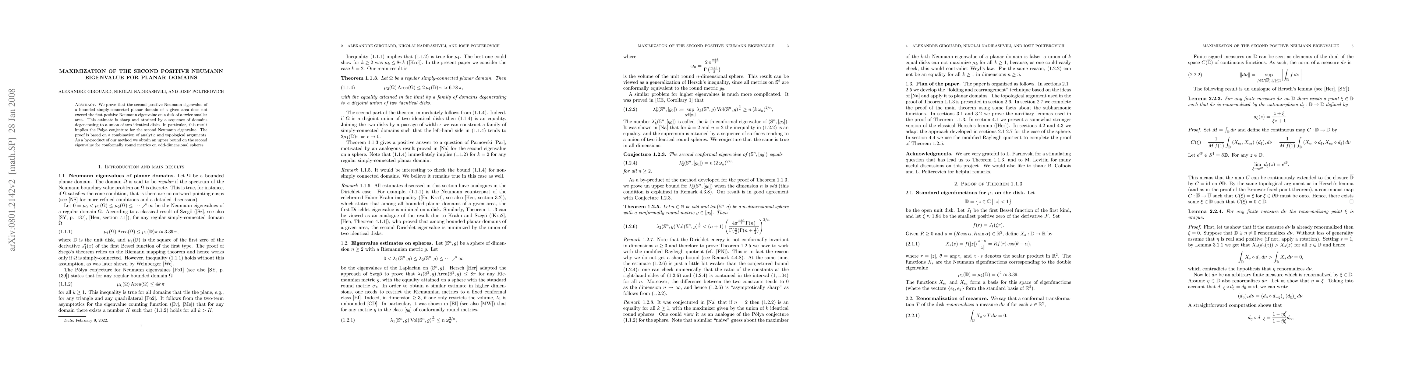 This paper proves that the second positive Neumann eigenvalue for a bounded planar domain of a given area is maximized when the domain is a disk of half that area, confirming the Polya conjecture for the second Neumann eigenvalue. The proof employs a mix of analytic and topological techniques.