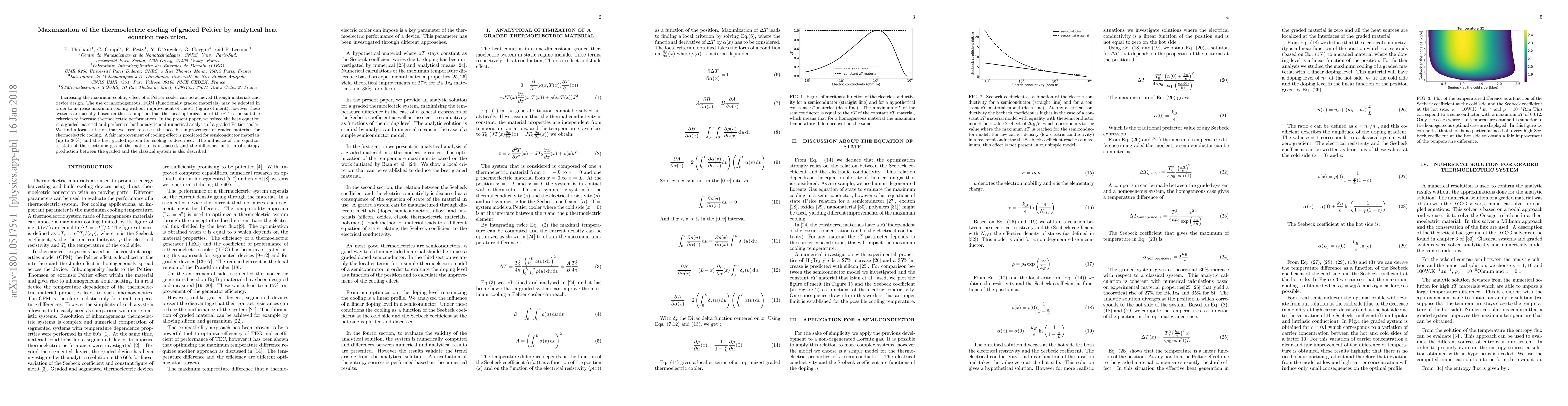 Increasing the maximum cooling effect of a Peltier cooler can be achieved through materials and device design. The use of inhomogeneous, FGM (functionally graded materials) may be adopted in order to increase maximum cooling without improvement of the zT (figure of merit), however these systems are usually based on the assumption that the local optimization of the zT is the suitable criterion to increase thermoelectric performances. In the present paper, we solved the heat equation in a graded material and performed both analytic and numerical analysis of a graded Peltier cooler. We find a local criterion that we used to assess the possible improvement of graded materials for thermoelectric cooling. A fair improvement of cooling effect is predicted for semiconductor materials (up to $36\%$) and the best graded system for cooling is described. The influence of the equation of state of the electronic gas of the material is discussed, and the difference in term of entropy production between the graded and the classical system is also described.