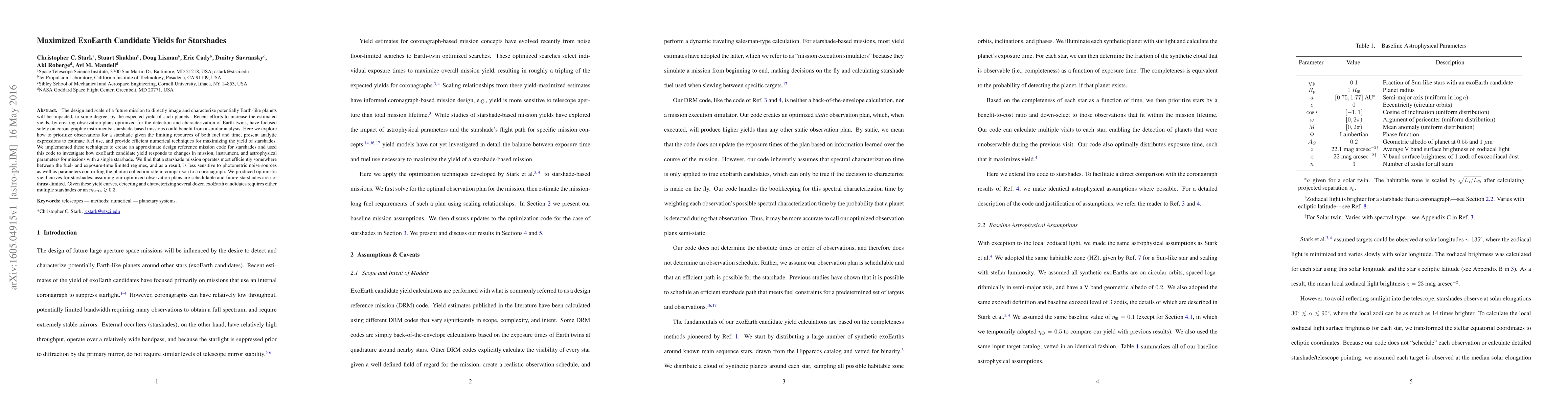 The design and scale of a future mission to directly image and characterize potentially Earth-like planets will be impacted, to some degree, by the expected yield of such planets. Recent efforts to increase the estimated yields, by creating observation plans optimized for the detection and characterization of Earth-twins, have focused solely on coronagraphic instruments; starshade-based missions could benefit from a similar analysis. Here we explore how to prioritize observations for a starshade given the limiting resources of both fuel and time, present analytic expressions to estimate fuel use, and provide efficient numerical techniques for maximizing the yield of starshades. We implemented these techniques to create an approximate design reference mission code for starshades and used this code to investigate how exoEarth candidate yield responds to changes in mission, instrument, and astrophysical parameters for missions with a single starshade. We find that a starshade mission operates most efficiently somewhere between the fuel- and exposure-time limited regimes, and as a result, is less sensitive to photometric noise sources as well as parameters controlling the photon collection rate in comparison to a coronagraph. We produced optimistic yield curves for starshades, assuming our optimized observation plans are schedulable and future starshades are not thrust-limited. Given these yield curves, detecting and characterizing several dozen exoEarth candidates requires either multiple starshades or an eta_Earth > ~0.3.