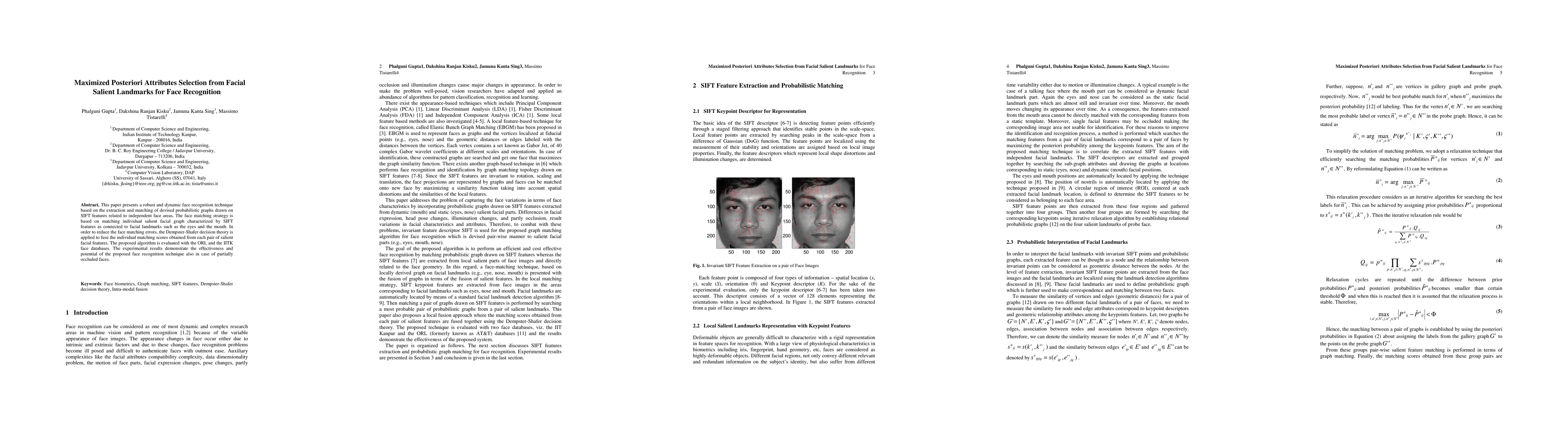 This paper presents a robust and dynamic face recognition technique based on the extraction and matching of devised probabilistic graphs drawn on SIFT features related to independent face areas. The face matching strategy is based on matching individual salient facial graph characterized by SIFT features as connected to facial landmarks such as the eyes and the mouth. In order to reduce the face matching errors, the Dempster-Shafer decision theory is applied to fuse the individual matching scores obtained from each pair of salient facial features. The proposed algorithm is evaluated with the ORL and the IITK face databases. The experimental results demonstrate the effectiveness and potential of the proposed face recognition technique also in case of partially occluded faces.