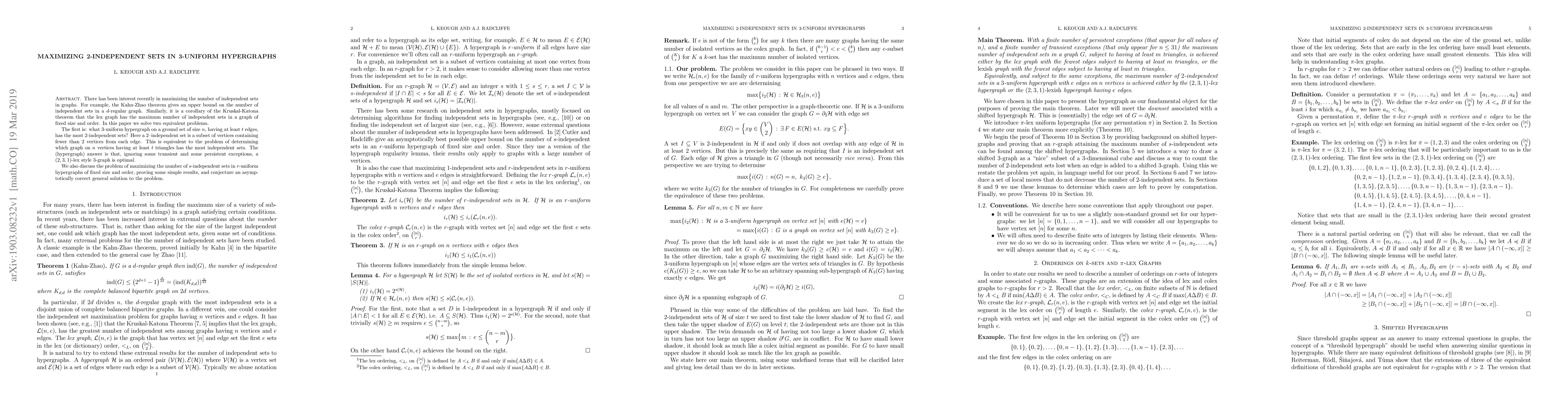 This paper addresses the maximization of $2$-independent sets in $3$-uniform hypergraphs, showing that a $(2,3,1)$-lex style $3$-graph typically has the most such sets, equivalent to finding the graph with the most independent sets among those having at least $t$ triangles. It also explores the broader problem of maximizing $s$-independent sets in $r$-uniform hypergraphs, providing simple results and a conjecture for an asymptotically correct general solution.