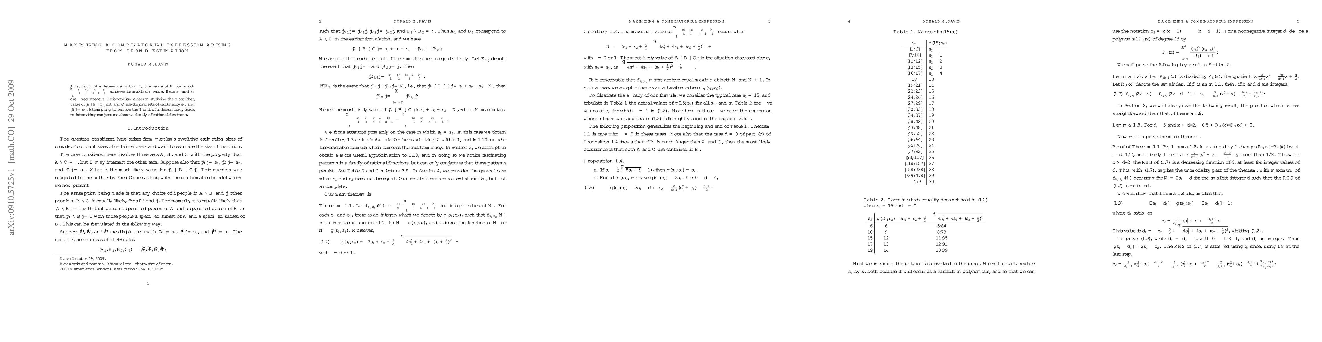 We determine, within 1, the value of N for which sum (s1 choose i)(s2 choose N)(s1 choose N-i)(N choose i) achieves its maximum value. Here s1 and s2 are fixed integers. This problem arises in studying the most likely value for the size of the union of A, B, and C if A and C are disjoint sets of size s1, and B is a set of size s2. Attempting to remove the 1 unit of indeterminacy leads to interesting conjectures about a family of rational functions.