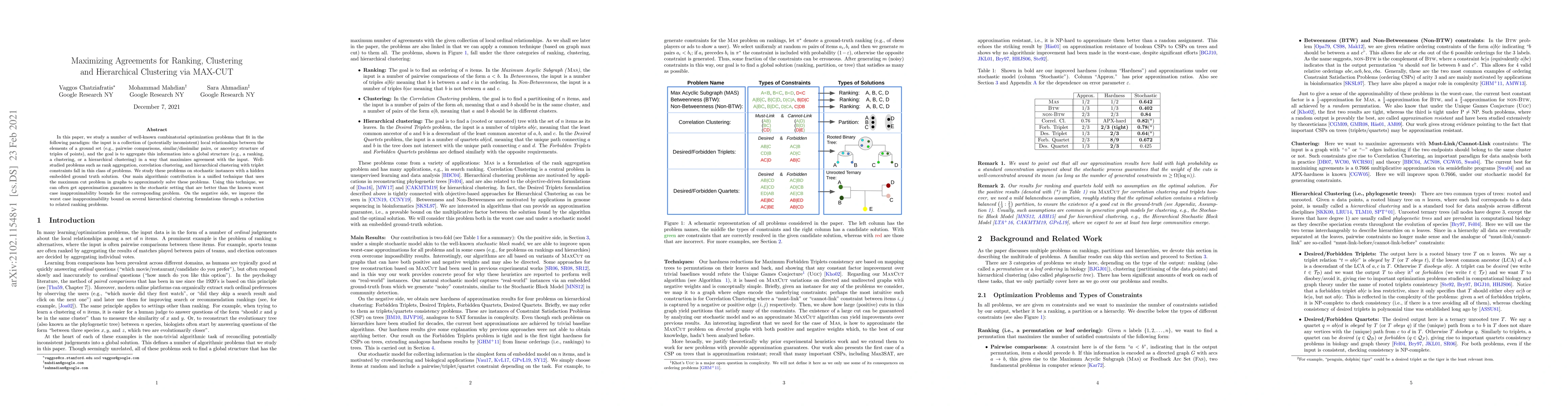 This paper proposes a unified algorithmic technique leveraging the MAX-CUT problem to solve various combinatorial optimization problems like rank aggregation and clustering, achieving better approximations in stochastic settings compared to known worst-case bounds. It also improves the worst-case inapproximability bounds for certain hierarchical clustering formulations.