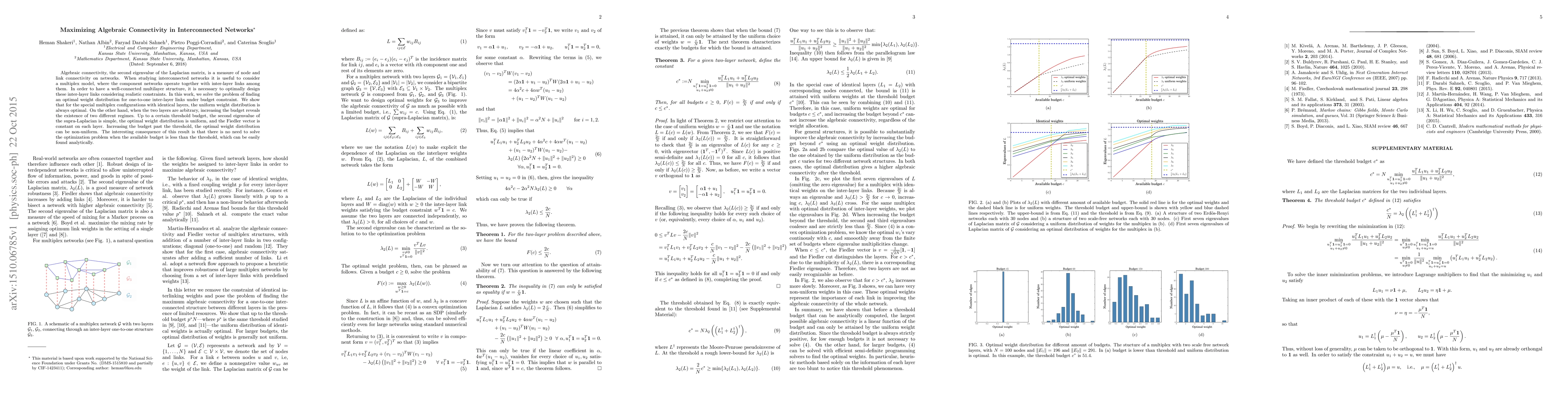 Algebraic connectivity, the second eigenvalue of the Laplacian matrix, is a measure of node and link connectivity on networks. When studying interconnected networks it is useful to consider a multiplex model, where the component networks operate together with inter-layer links among them. In order to have a well-connected multilayer structure, it is necessary to optimally design these inter-layer links considering realistic constraints. In this work, we solve the problem of finding an optimal weight distribution for one-to-one inter-layer links under budget constraint. We show that for the special multiplex configurations with identical layers, the uniform weight distribution is always optimal. On the other hand, when the two layers are arbitrary, increasing the budget reveals the existence of two different regimes. Up to a certain threshold budget, the second eigenvalue of the supra-Laplacian is simple, the optimal weight distribution is uniform, and the Fiedler vector is constant on each layer. Increasing the budget past the threshold, the optimal weight distribution can be non-uniform. The interesting consequence of this result is that there is no need to solve the optimization problem when the available budget is less than the threshold, which can be easily found analytically.