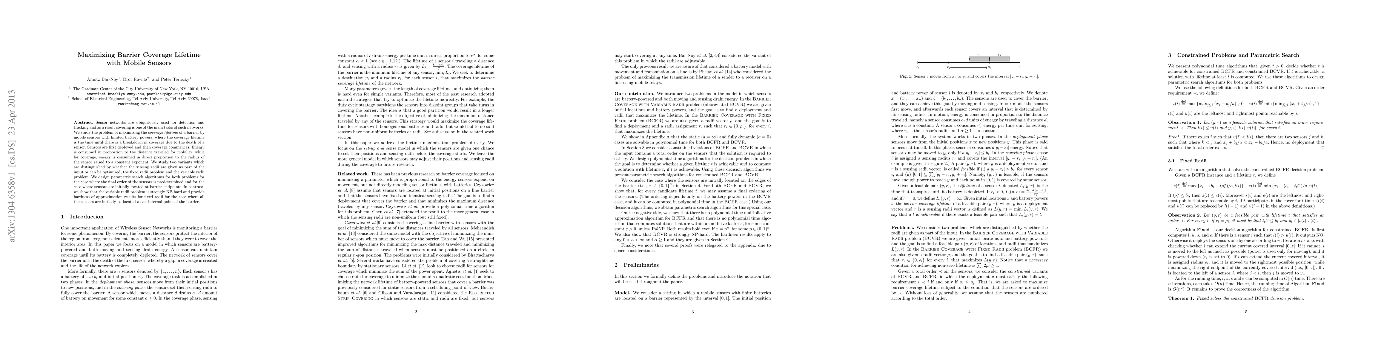 This paper investigates methods to extend the operational lifetime of barrier coverage in sensor networks using mobile sensors with limited battery life. It proposes algorithms for maximizing coverage lifetime in both fixed and variable sensing radii scenarios, demonstrating the computational complexity of the variable radii problem.
