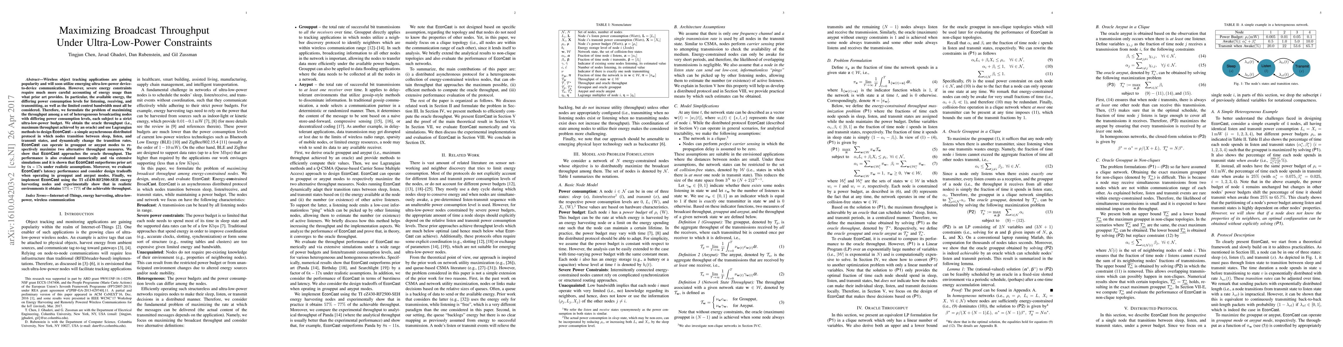Wireless object tracking applications are gaining popularity and will soon utilize emerging ultra-low-power device-to-device communication. However, severe energy constraints require much more careful accounting of energy usage than what prior art provides. In particular, the available energy, the differing power consumption levels for listening, receiving, and transmitting, as well as the limited control bandwidth must all be considered. Therefore, we formulate the problem of maximizing the throughput among a set of heterogeneous broadcasting nodes with differing power consumption levels, each subject to a strict ultra-low-power budget. We obtain the oracle throughput (i.e., maximum throughput achieved by an oracle) and use Lagrangian methods to design EconCast - a simple asynchronous distributed protocol in which nodes transition between sleep, listen, and transmit states, and dynamically change the transition rates. EconCast can operate in groupput or anyput modes to respectively maximize two alternative throughput measures. We show that EconCast approaches the oracle throughput. The performance is also evaluated numerically and via extensive simulations and it is shown that EconCast outperforms prior art by 6x - 17x under realistic assumptions. Moreover, we evaluate EconCast's latency performance and consider design tradeoffs when operating in groupput and anyput modes. Finally, we implement EconCast using the TI eZ430-RF2500-SEH energy harvesting nodes and experimentally show that in realistic environments it obtains 57% - 77% of the achievable throughput.