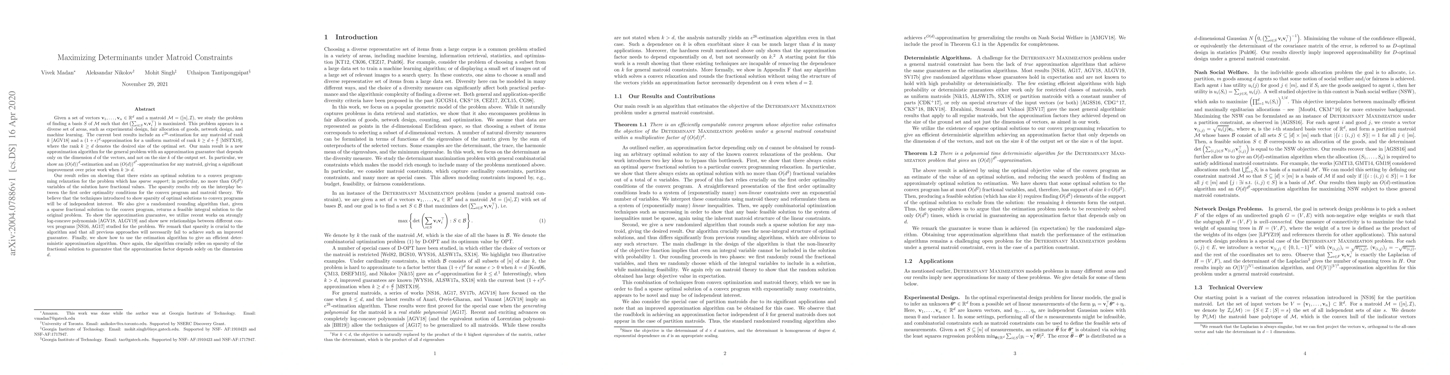 Given vectors $v_1,\dots,v_n\in\mathbb{R}^d$ and a matroid $M=([n],I)$, we study the problem of finding a basis $S$ of $M$ such that $\det(\sum_{i \in S}v_i v_i^\top)$ is maximized. This problem appears in a diverse set of areas such as experimental design, fair allocation of goods, network design, and machine learning. The current best results include an $e^{2k}$-estimation for any matroid of rank $k$ and a $(1+\epsilon)^d$-approximation for a uniform matroid of rank $k\ge d+\frac d\epsilon$, where the rank $k\ge d$ denotes the desired size of the optimal set. Our main result is a new approximation algorithm with an approximation guarantee that depends only on the dimension $d$ of the vectors and not on the size $k$ of the output set. In particular, we show an $(O(d))^{d}$-estimation and an $(O(d))^{d^3}$-approximation for any matroid, giving a significant improvement over prior work when $k\gg d$. Our result relies on the existence of an optimal solution to a convex programming relaxation for the problem which has sparse support; in particular, no more than $O(d^2)$ variables of the solution have fractional values. The sparsity results rely on the interplay between the first-order optimality conditions for the convex program and matroid theory. We believe that the techniques introduced to show sparsity of optimal solutions to convex programs will be of independent interest. We also give a randomized algorithm that rounds a sparse fractional solution to a feasible integral solution to the original problem. To show the approximation guarantee, we utilize recent works on strongly log-concave polynomials and show new relationships between different convex programs studied for the problem. Finally, we use the estimation algorithm and sparsity results to give an efficient deterministic approximation algorithm with an approximation guarantee that depends solely on the dimension $d$.