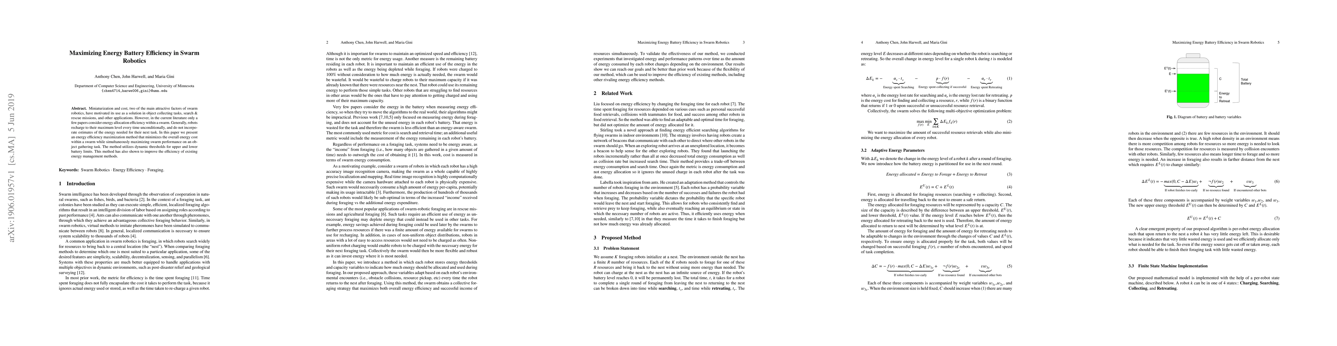This paper proposes a method to maximize energy efficiency in swarm robotics by dynamically adjusting battery thresholds to minimize overall energy costs while optimizing swarm performance in tasks like object gathering. The approach improves upon existing energy management techniques.