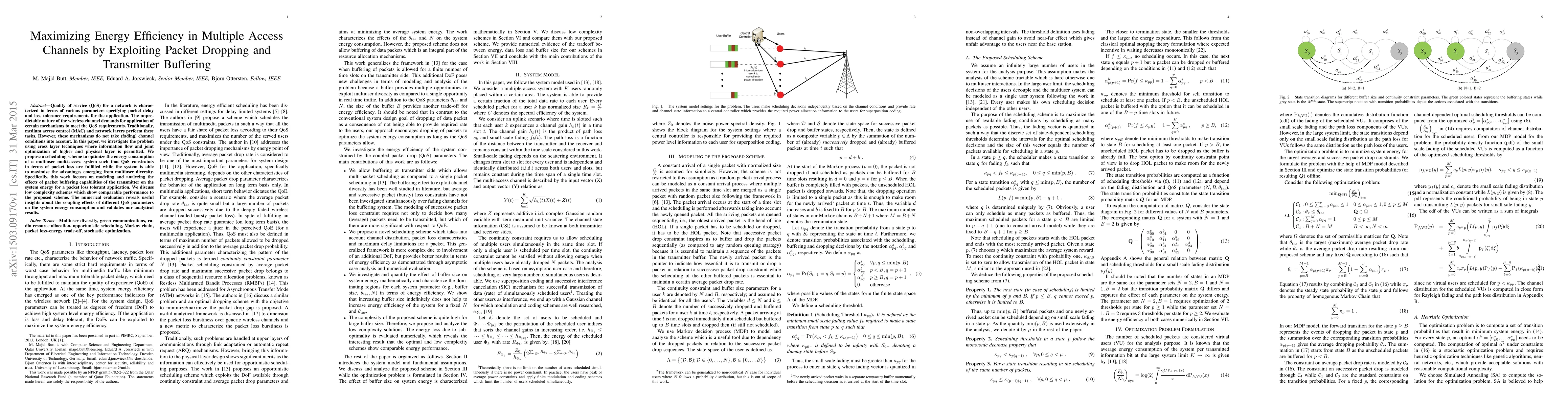 Quality of service (QoS) for a network is characterized in terms of various parameters specifying packet delay and loss tolerance requirements for the application. The unpredictable nature of the wireless channel demands for application of certain mechanisms to meet the QoS requirements. Traditionally, medium access control (MAC) and network layers perform these tasks. However, these mechanisms do not take (fading) channel conditions into account. In this paper, we investigate the problem using cross layer techniques where information flow and joint optimization of higher and physical layer is permitted. We propose a scheduling scheme to optimize the energy consumption of a multiuser multi-access system such that QoS constraints in terms of packet loss are fulfilled while the system is able to maximize the advantages emerging from multiuser diversity. Specifically, this work focuses on modeling and analyzing the effects of packet buffering capabilities of the transmitter on the system energy for a packet loss tolerant application. We discuss low complexity schemes which show comparable performance to the proposed scheme. The numerical evaluation reveals useful insights about the coupling effects of different QoS parameters on the system energy consumption and validates our analytical results.