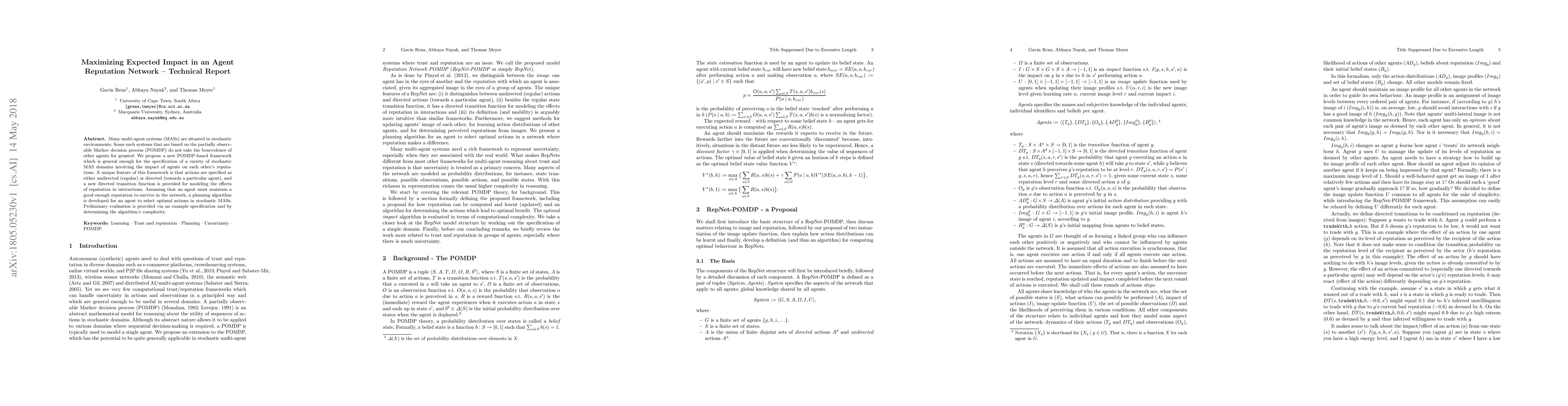 Many multi-agent systems (MASs) are situated in stochastic environments. Some such systems that are based on the partially observable Markov decision process (POMDP) do not take the benevolence of other agents for granted. We propose a new POMDP-based framework which is general enough for the specification of a variety of stochastic MAS domains involving the impact of agents on each other's reputations. A unique feature of this framework is that actions are specified as either undirected (regular) or directed (towards a particular agent), and a new directed transition function is provided for modeling the effects of reputation in interactions. Assuming that an agent must maintain a good enough reputation to survive in the network, a planning algorithm is developed for an agent to select optimal actions in stochastic MASs. Preliminary evaluation is provided via an example specification and by determining the algorithm's complexity.