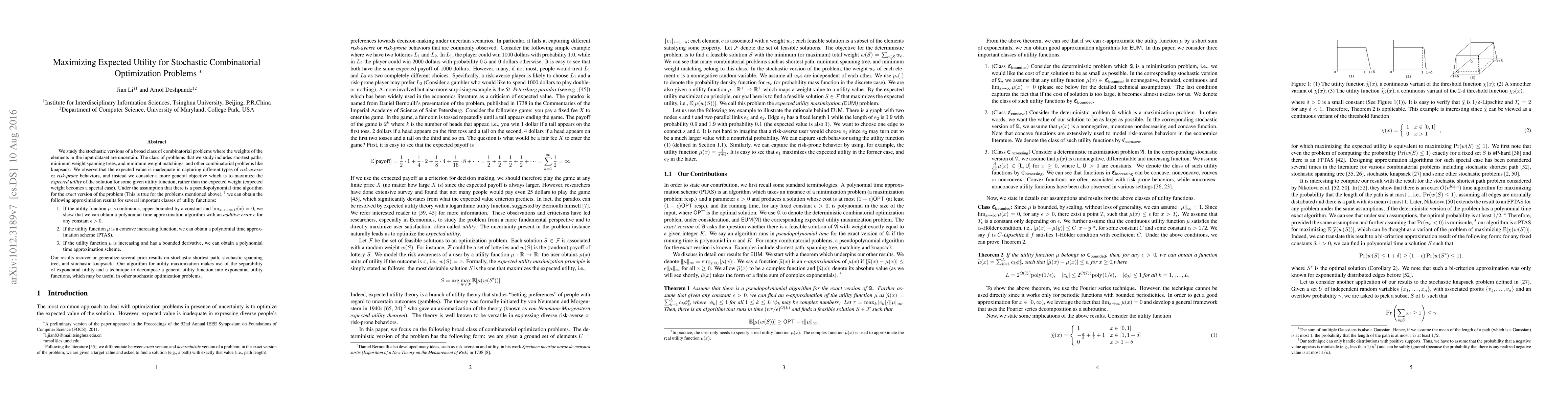 We study the stochastic versions of a broad class of combinatorial problems where the weights of the elements in the input dataset are uncertain. The class of problems that we study includes shortest paths, minimum weight spanning trees, and minimum weight matchings, and other combinatorial problems like knapsack. We observe that the expected value is inadequate in capturing different types of {\em risk-averse} or {\em risk-prone} behaviors, and instead we consider a more general objective which is to maximize the {\em expected utility} of the solution for some given utility function, rather than the expected weight (expected weight becomes a special case). Under the assumption that there is a pseudopolynomial time algorithm for the {\em exact} version of the problem (This is true for the problems mentioned above), we can obtain the following approximation results for several important classes of utility functions: (1) If the utility function $\uti$ is continuous, upper-bounded by a constant and $\lim_{x\rightarrow+\infty}\uti(x)=0$, we show that we can obtain a polynomial time approximation algorithm with an {\em additive error} $\epsilon$ for any constant $\epsilon>0$. (2) If the utility function $\uti$ is a concave increasing function, we can obtain a polynomial time approximation scheme (PTAS). (3) If the utility function $\uti$ is increasing and has a bounded derivative, we can obtain a polynomial time approximation scheme. Our results recover or generalize several prior results on stochastic shortest path, stochastic spanning tree, and stochastic knapsack. Our algorithm for utility maximization makes use of the separability of exponential utility and a technique to decompose a general utility function into exponential utility functions, which may be useful in other stochastic optimization problems.