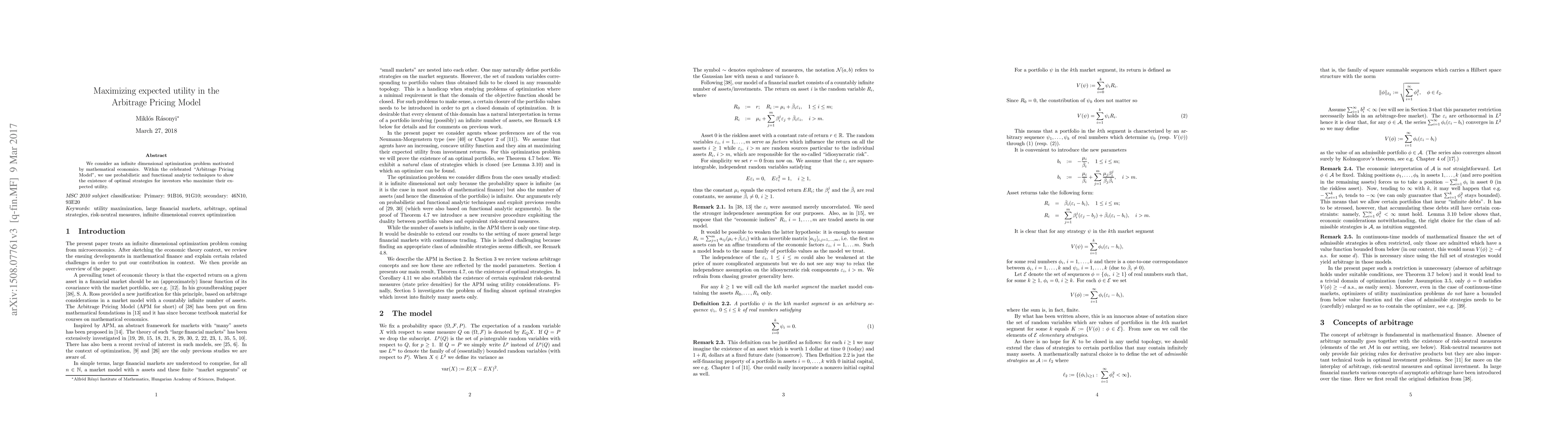 We consider an infinite dimensional optimization problem motivated by mathematical economics. Within the celebrated "Arbitrage Pricing Model", we use probabilistic and functional analytic techniques to show the existence of optimal strategies for investors who maximize their expected utility.