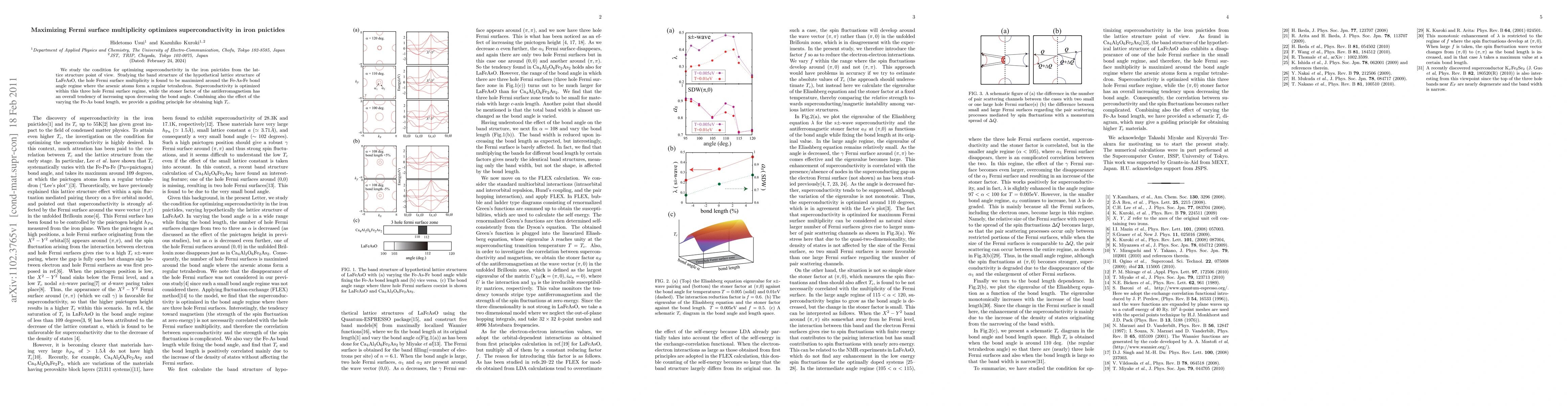 This study reveals that maximizing hole Fermi surface multiplicity in iron pnictides, particularly around the Fe-As-Fe bond angle forming a regular tetrahedron, optimizes superconductivity. The research also notes an increase in the antiferromagnetic Stoner factor with decreasing bond angle, providing a principle for achieving high critical temperatures ($T_c$).