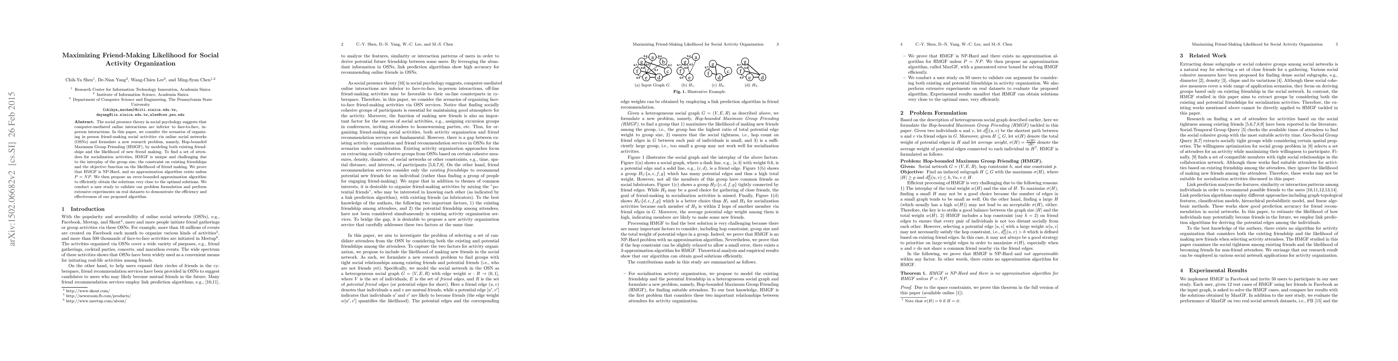 This paper introduces Hop-bounded Maximum Group Friending (HMGF), a problem formulation for optimizing friend-making likelihood in in-person social activities using online social networks. Despite HMGF's NP-Hard nature and lack of approximation algorithm unless P=NP, the authors propose an error-bounded approximation algorithm. Their user study and experiments on real datasets validate the problem's relevance and the algorithm's efficiency and effectiveness.