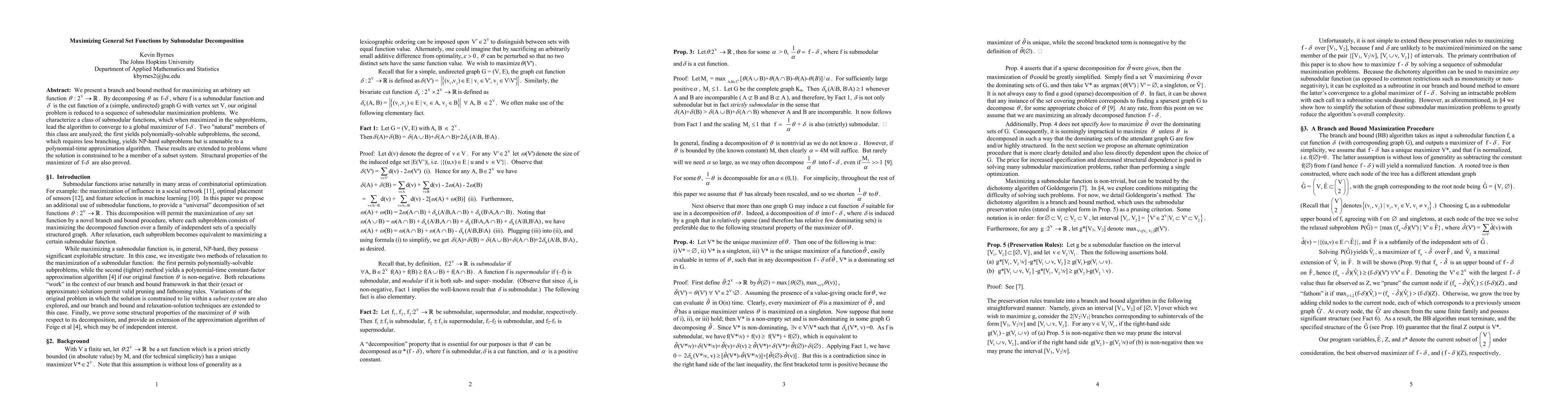 We present a branch and bound method for maximizing an arbitrary set function h mapping 2^V to R. By decomposing h as f-g, where f is a submodular function and g is the cut function of a (simple, undirected) graph G with vertex set V, our original problem is reduced to a sequence of submodular maximization problems. We characterize a class of submodular functions, which when maximized in the subproblems, lead the algorithm to converge to a global maximizer of f-g. Two "natural" members of this class are analyzed; the first yields polynomially-solvable subproblems, the second, which requires less branching, yields NP-hard subproblems but is amenable to a polynomial-time approximation algorithm. These results are extended to problems where the solution is constrained to be a member of a subset system. Structural properties of the maximizer of f-g are also proved.