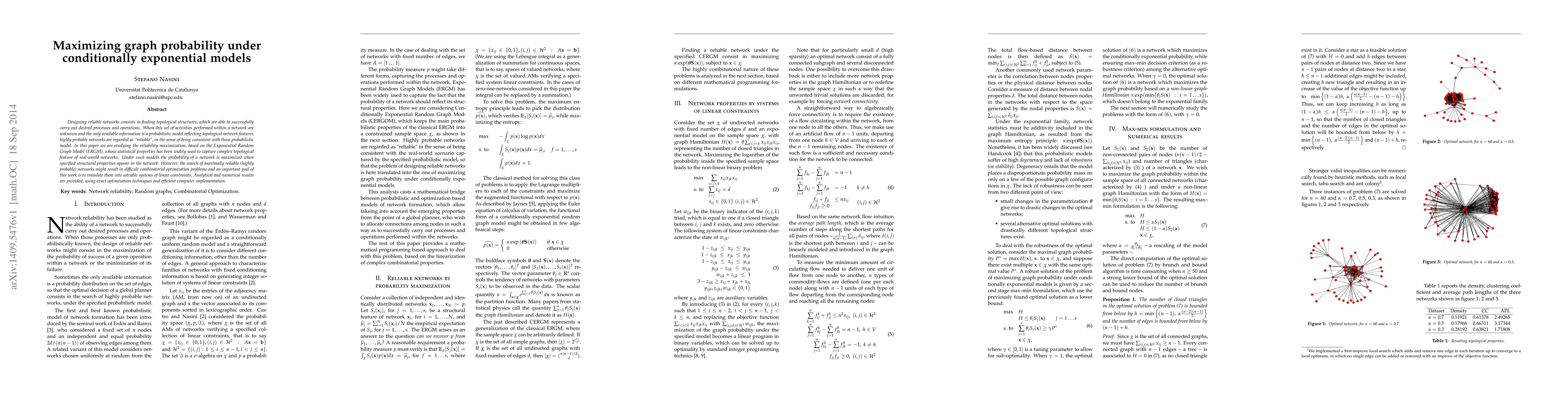 Designing reliable networks consists in finding topological structures, which are able to successfully carry out desired processes and operations. When this set of activities performed within a network are unknown and the only available information is a probabilistic model reflecting topological network features, highly probable networks are regarded as "reliable", in the sense of being consistent with those probabilistic model. In this paper we are studying the reliability maximization, based on the Exponential Random Graph Model (ERGM), whose statistical properties has been widely used to capture complex topological feature of real-world networks. Under such models the probability of a network is maximized when specified structural properties appear in the network. However, the search of maximally reliable (highly probable) networks might result in difficult combinatorial optimization problems and an important goal of this work is to translate them into solvable systems of linear constraints. Analytical and numerical results are provided, using exact optimization techniques and efficient computer implementation.