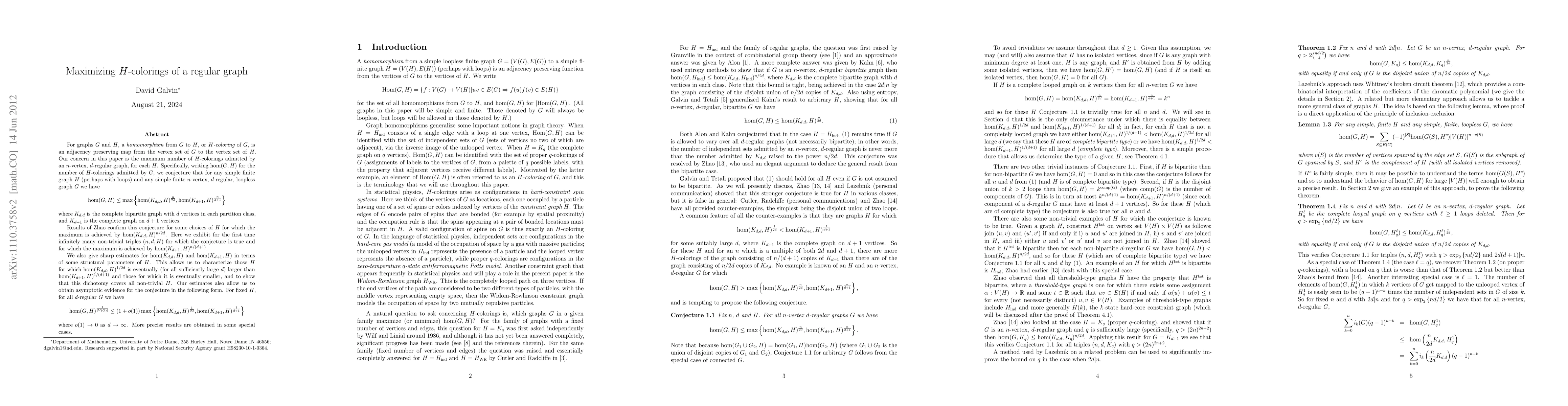 For graphs $G$ and $H$, a {\em homomorphism} from $G$ to $H$, or {\em $H$-coloring} of $G$, is an adjacency preserving map from the vertex set of $G$ to the vertex set of $H$. Writing ${\rm hom}(G,H)$ for the number of $H$-colorings admitted by $G$, we conjecture that for any simple finite graph $H$ (perhaps with loops) and any simple finite $n$-vertex, $d$-regular, loopless graph $G$ we have $$ {\rm hom}(G,H) \leq \max{{\rm hom}(K_{d,d},H)^{\frac{n}{2d}}, {\rm hom}(K_{d+1},H)^{\frac{n}{d+1}}} $$ where $K_{d,d}$ is the complete bipartite graph with $d$ vertices in each partition class, and $K_{d+1}$ is the complete graph on $d+1$ vertices. Results of Zhao confirm this conjecture for some choices of $H$ for which the maximum is achieved by ${\rm hom}(K_{d,d},H)^{n/2d}$. Here we exhibit infinitely many non-trivial triples $(n,d,H)$ for which the conjecture is true and for which the maximum is achieved by ${\rm hom}(K_{d+1},H)^{n/(d+1)}$. We also give sharp estimates for ${\rm hom}(K_{d,d},H)$ and ${\rm hom}(K_{d+1},H)$ in terms of some structural parameters of $H$. This allows us to characterize those $H$ for which ${\rm hom}(K_{d,d},H)^{1/2d}$ is eventually (for all sufficiently large $d$) larger than ${\rm hom}(K_{d+1},H)^{1/(d+1)}$ and those for which it is eventually smaller, and to show that this dichotomy covers all non-trivial $H$. Our estimates also allow us to obtain asymptotic evidence for the conjecture in the following form. For fixed $H$, for all $d$-regular $G$ we have $$ {\rm hom}(G,H)^{\frac{1}{|V(G)|}} \leq (1+o(1))\max{{\rm hom}(K_{d,d},H)^{\frac{1}{2d}}, {\rm hom}(K_{d+1},H)^{\frac{1}{d+1}}} $$ where $o(1)\rightarrow 0$ as $d \rightarrow \infty$. More precise results are obtained in some special cases.