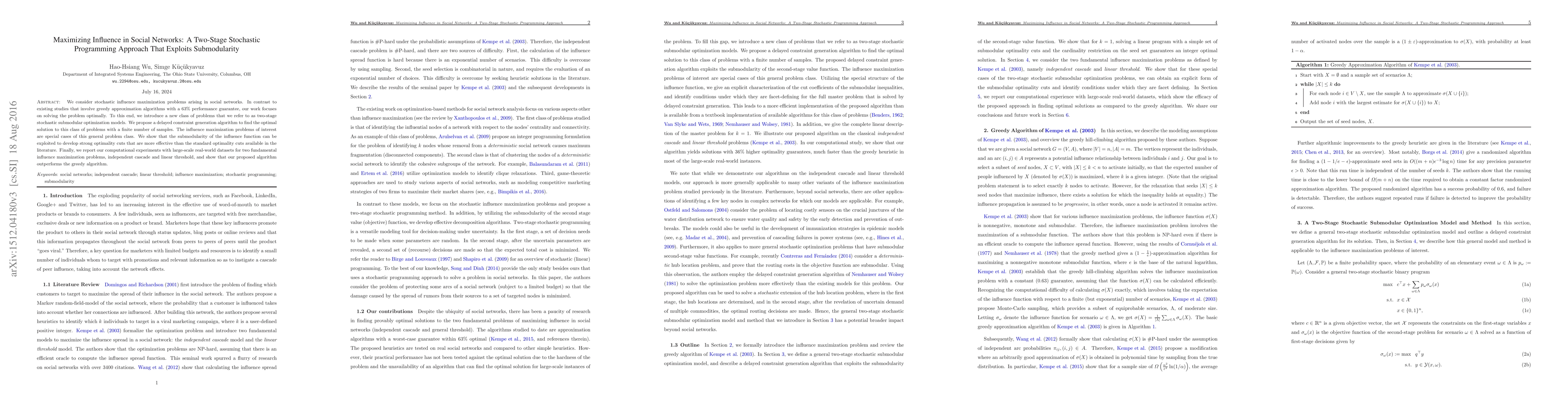 This paper proposes an optimal two-stage stochastic programming approach to maximize influence in social networks, leveraging submodularity for strong optimality cuts. The delayed constraint generation algorithm outperforms existing greedy methods, as demonstrated through experiments on large-scale real-world datasets.