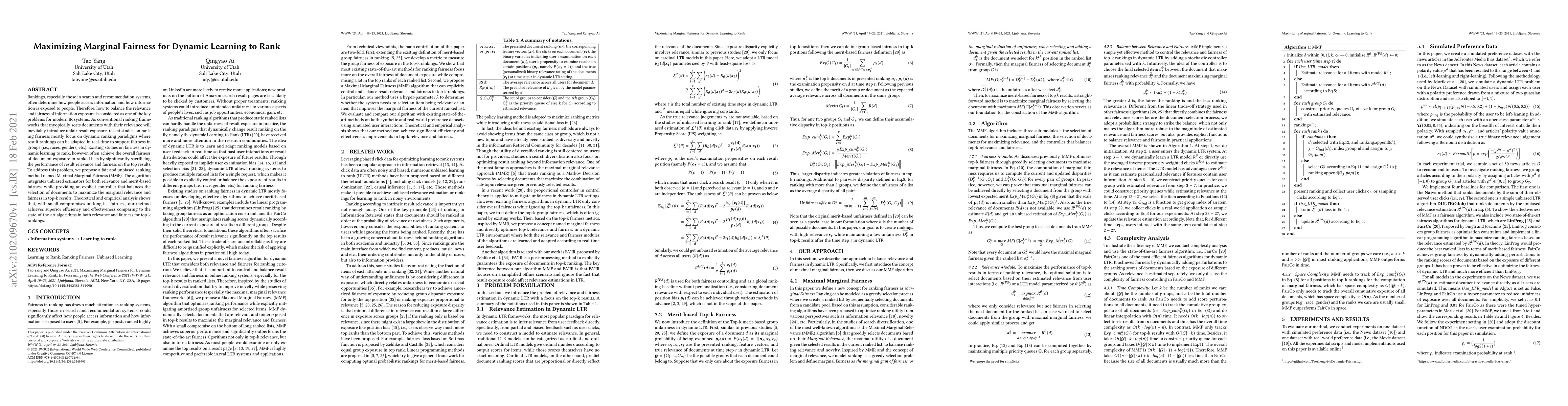 Rankings, especially those in search and recommendation systems, often determine how people access information and how information is exposed to people. Therefore, how to balance the relevance and fairness of information exposure is considered as one of the key problems for modern IR systems. As conventional ranking frameworks that myopically sorts documents with their relevance will inevitably introduce unfair result exposure, recent studies on ranking fairness mostly focus on dynamic ranking paradigms where result rankings can be adapted in real-time to support fairness in groups (i.e., races, genders, etc.). Existing studies on fairness in dynamic learning to rank, however, often achieve the overall fairness of document exposure in ranked lists by significantly sacrificing the performance of result relevance and fairness on the top results. To address this problem, we propose a fair and unbiased ranking method named Maximal Marginal Fairness (MMF). The algorithm integrates unbiased estimators for both relevance and merit-based fairness while providing an explicit controller that balances the selection of documents to maximize the marginal relevance and fairness in top-k results. Theoretical and empirical analysis shows that, with small compromises on long list fairness, our method achieves superior efficiency and effectiveness comparing to the state-of-the-art algorithms in both relevance and fairness for top-k rankings.