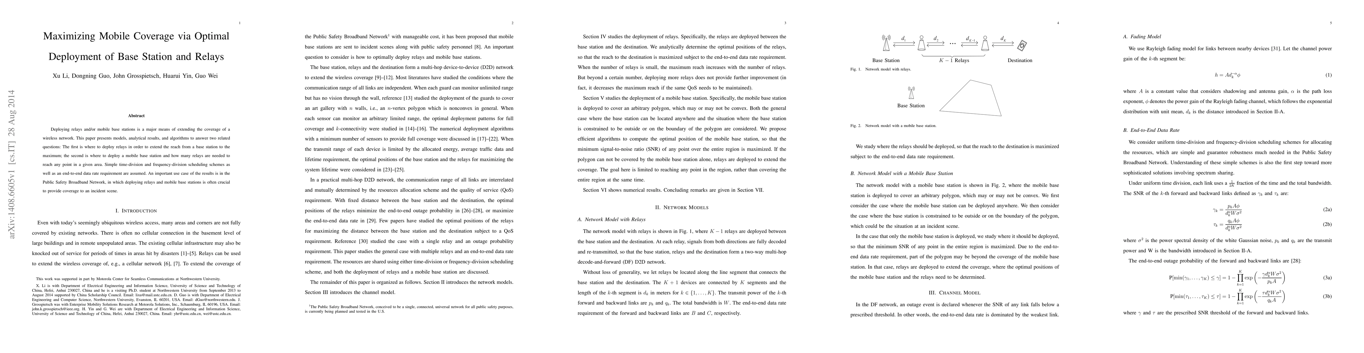 Deploying relays and/or mobile base stations is a major means of extending the coverage of a wireless network. This paper presents models, analytical results, and algorithms to answer two related questions: The first is where to deploy relays in order to extend the reach from a base station to the maximum; the second is where to deploy a mobile base station and how many relays are needed to reach any point in a given area. Simple time-division and frequency-division scheduling schemes as well as an end-to-end data rate requirement are assumed. An important use case of the results is in the Public Safety Broadband Network, in which deploying relays and mobile base stations is often crucial to provide coverage to an incident scene.