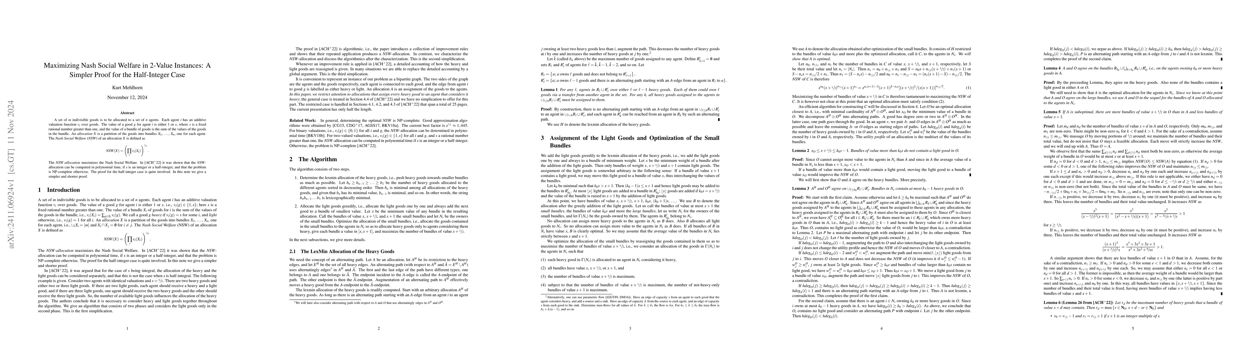 A set of $m$ indivisible goods is to be allocated to a set of $n$ agents. Each agent $i$ has an additive valuation function $v_i$ over goods. The value of a good $g$ for agent $i$ is either $1$ or $s$, where $s$ is a fixed rational number greater than one, and the value of a bundle of goods is the sum of the values of the goods in the bundle. An \emph{allocation} $X$ is a partition of the goods into bundles $X_1$, \ldots, $X_n$, one for each agent. The \emph{Nash Social Welfare} ($\NSW$) of an allocation $X$ is defined as \[ \NSW(X) = \left( \prod_i v_i(X_i) \right)^{\sfrac{1}{n}}.\] The \emph{$\NSW$-allocation} maximizes the Nash Social Welfare. In~\cite{NSW-twovalues-halfinteger} it was shown that the $\NSW$-allocation can be computed in polynomial time, if $s$ is an integer or a half-integer, and that the problem is NP-complete otherwise. The proof for the half-integer case is quite involved. In this note we give a simpler and shorter proof