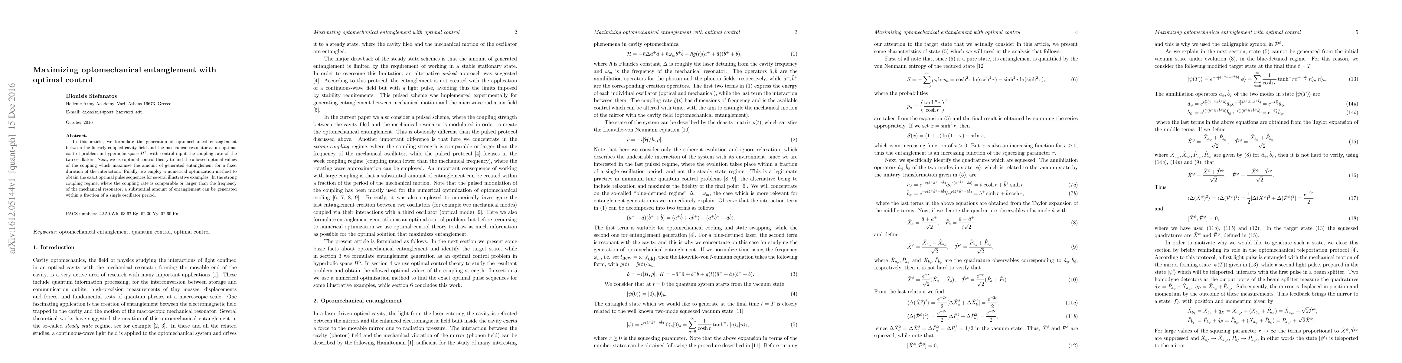 This paper formulates the generation of optomechanical entanglement as an optimal control problem in hyperbolic space $H^3$, using optimal control theory to maximize entanglement for a given interaction duration. Numerical optimization methods reveal substantial entanglement generation in the strong coupling regime.