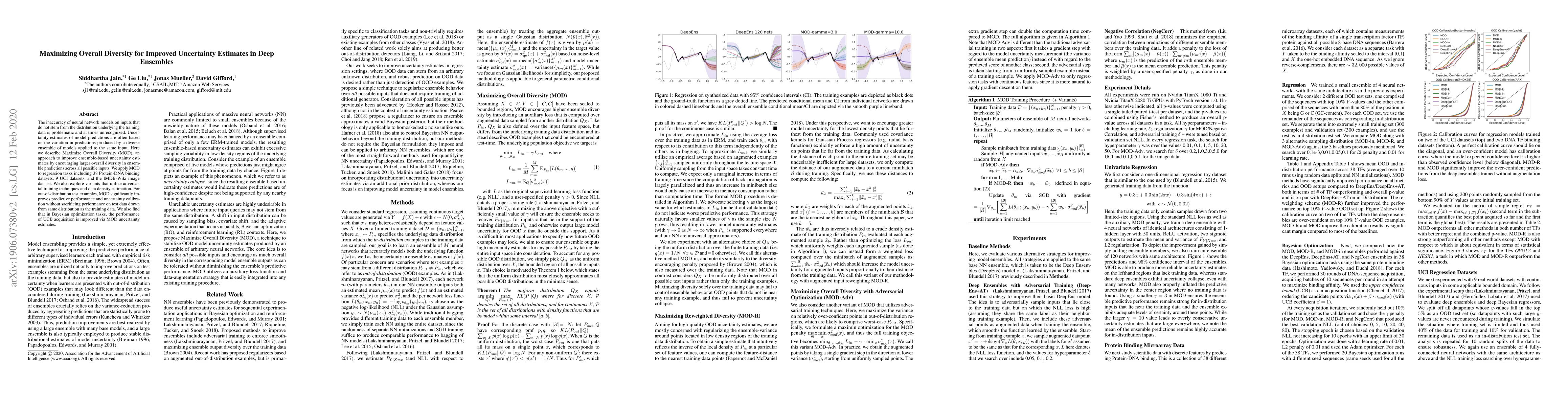 The inaccuracy of neural network models on inputs that do not stem from the training data distribution is both problematic and at times unrecognized. Model uncertainty estimation can address this issue, where uncertainty estimates are often based on the variation in predictions produced by a diverse ensemble of models applied to the same input. Here we describe Maximize Overall Diversity (MOD), a straightforward approach to improve ensemble-based uncertainty estimates by encouraging larger overall diversity in ensemble predictions across all possible inputs that might be encountered in the future. When applied to various neural network ensembles, MOD significantly improves predictive performance for out-of-distribution test examples without sacrificing in-distribution performance on 38 Protein-DNA binding regression datasets, 9 UCI datasets, and the IMDB-Wiki image dataset. Across many Bayesian optimization tasks, the performance of UCB acquisition is also greatly improved by leveraging MOD uncertainty estimates.